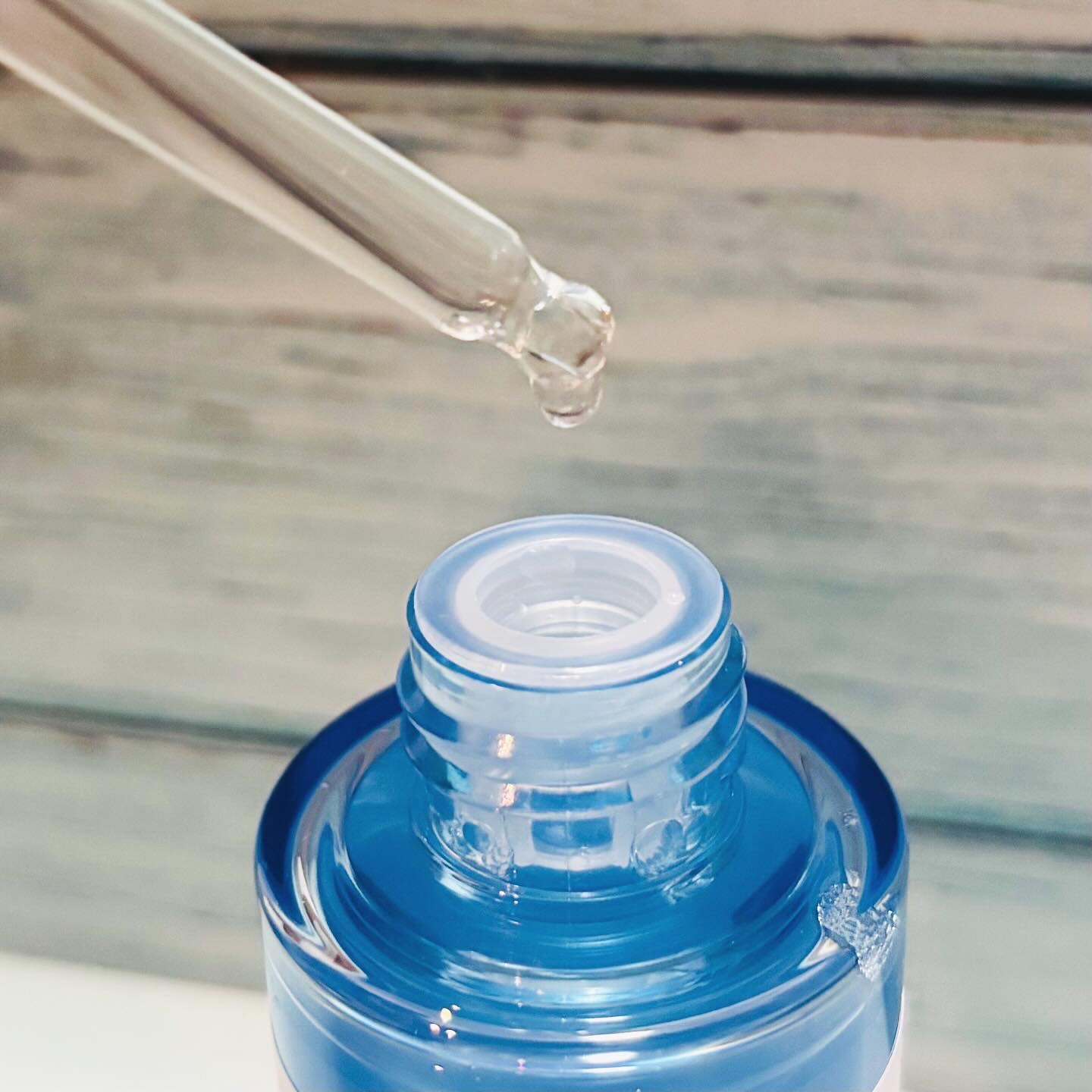 4重の保湿成分で72時間の水分持続効果 ✔️10種ヒアルロン酸により皮膚の内、外両面を保湿 馴染みが早い点が一番気に入りました。 ベタベタしません。 青色のパッケージが目を惹く美容液です。 透明で粘度は軽くあります。