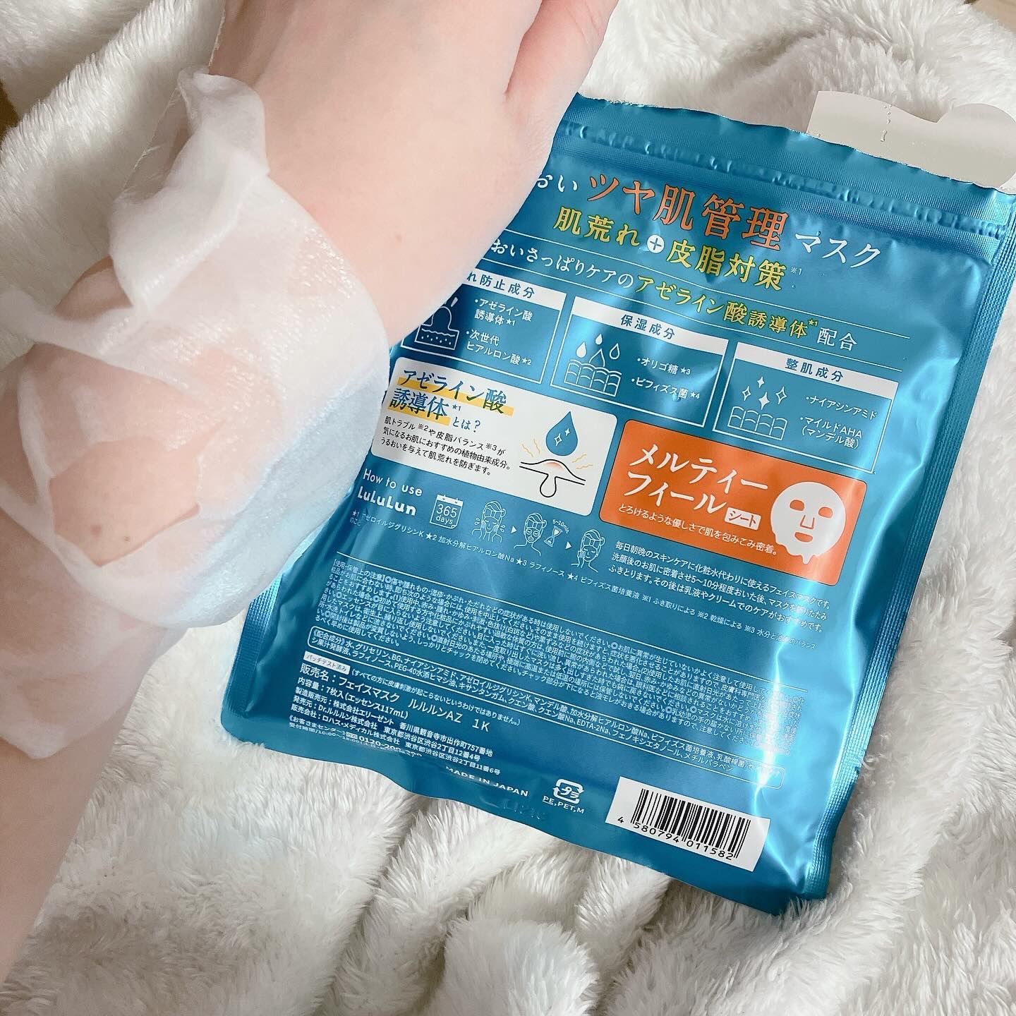 - 肌荒れ・皮脂ケア※1と健やかな肌の土台※2美容を叶える、アゼライン酸誘導体*1配合のうるおいツヤ肌管理マスクです。 肌荒れや肌の赤み、毛穴目立ちが気になる方に。 アゼライン酸*1×ナイアシンアミド*2+次世代ヒアルロン酸*3配合で、肌荒れをケアし、角質層をみずみずしいうるおいで満たします。 さらに肌表面でゆっくりと働くマイルドAHA*4が、古い角質をやわらげ、キメを整えることで、つるんとツヤめく素肌へ導きます。 シートはとろけるように肌に密着するメルティーフィールシートを採用。 シートが最も柔らかく感じられる液量を研究し、まるで水の層に包まれているような心地よさを実現しています。 (※1 ふき取りによる ※2 角質層のこと *1 肌荒れ防止成分 アゼロイルジグリシンK *2 整肌成分 *3 肌荒れ防止成分 加水分解ヒアルロン酸Na *4 整肌成分 マンデル酸)