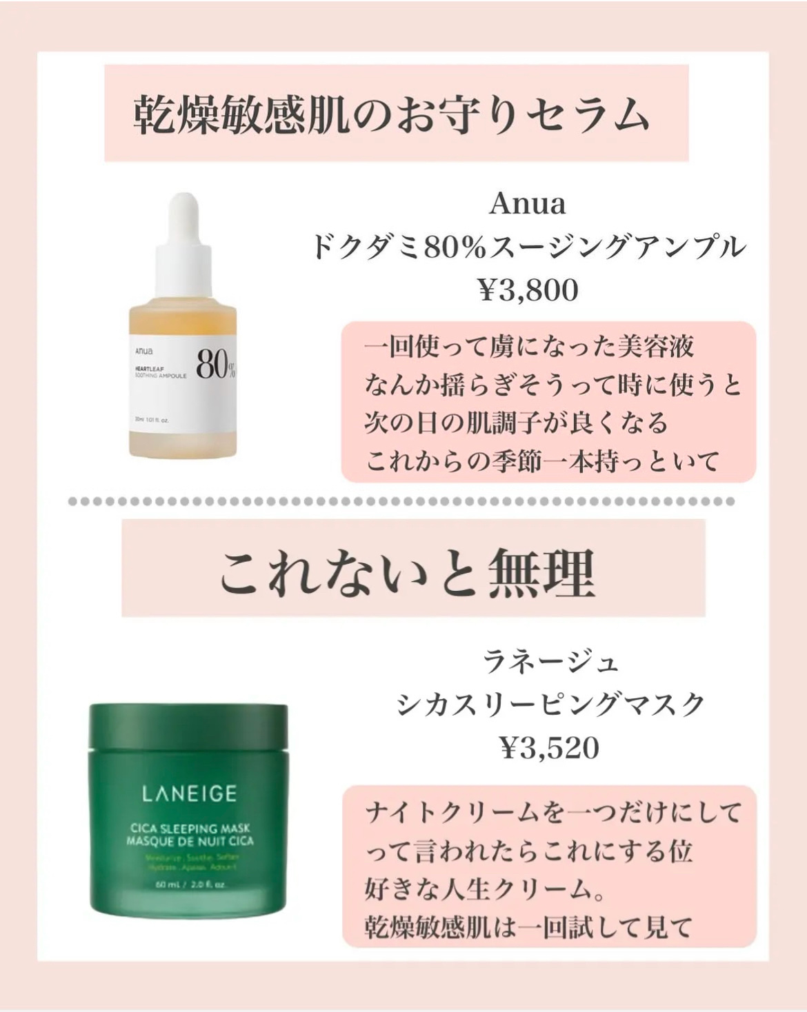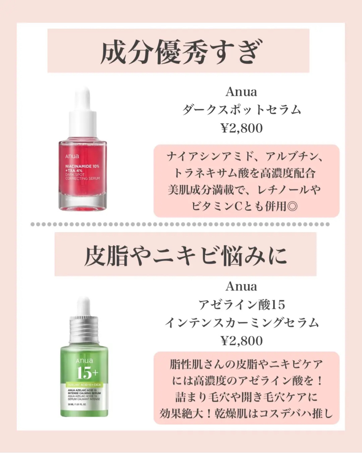 その他の投稿はこちらから→@haru_skincare_beauty本日は《アヌア美容液 結局どれがいいの?》のご紹介です🫶🏻🌿桃70%ナイアシンセラム🌿ドクダミ80%スージングアンプル🌿シラカバ70%水分ブースティングセラム🌿7ライスセラミ...