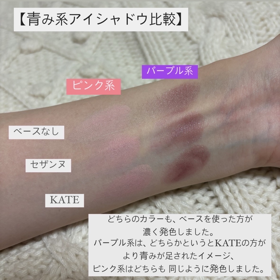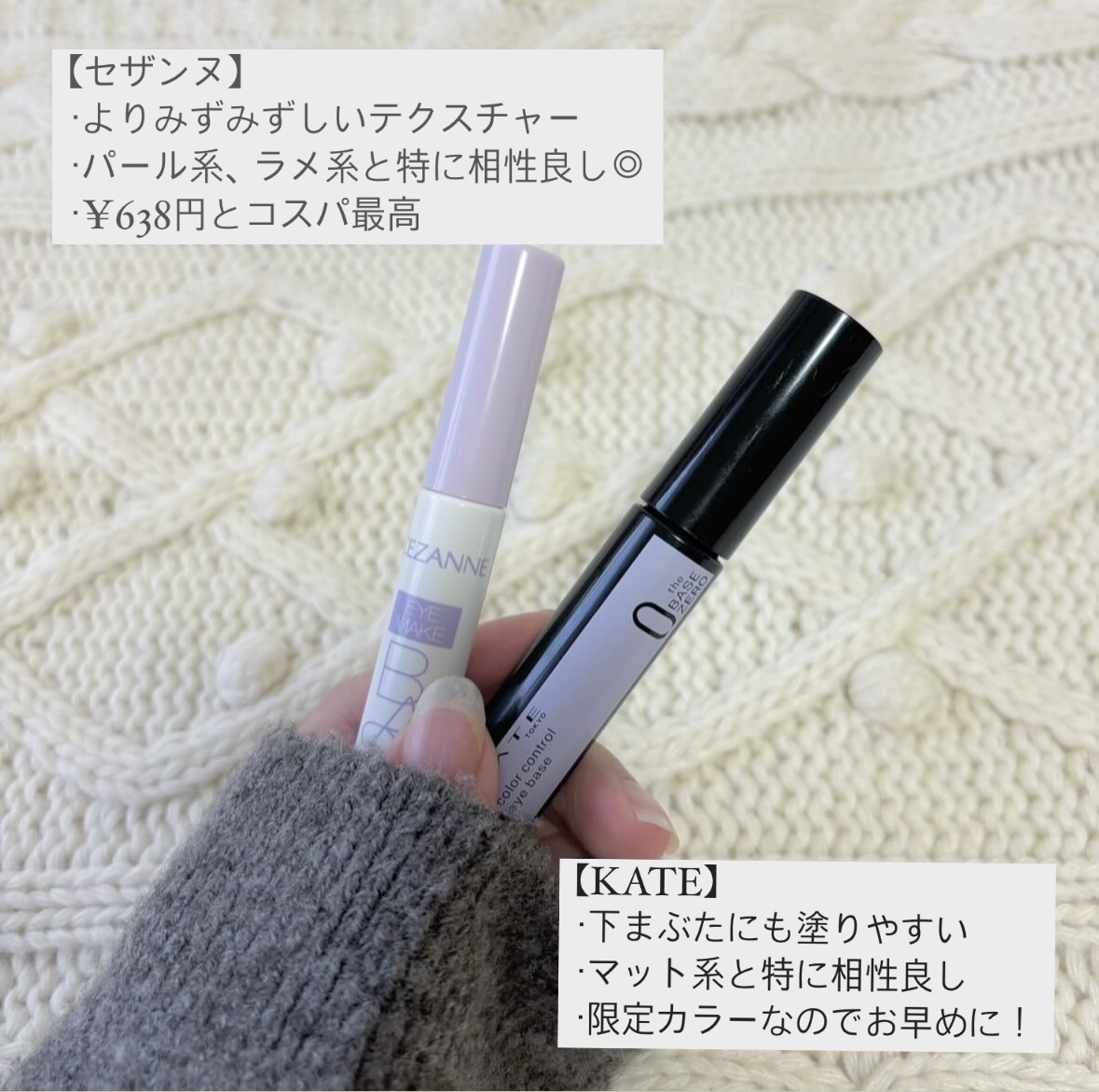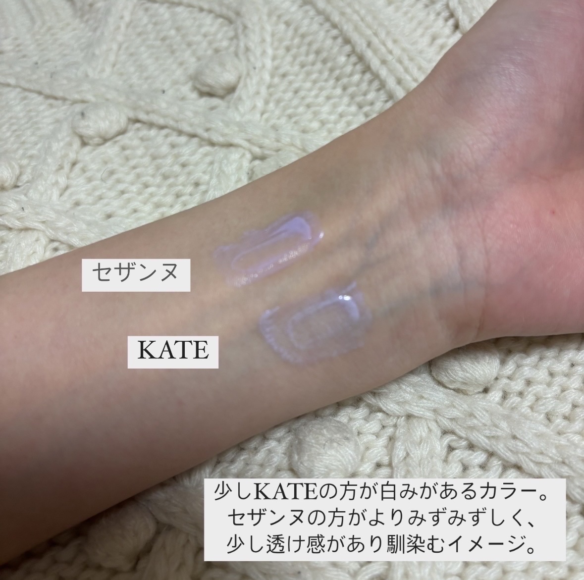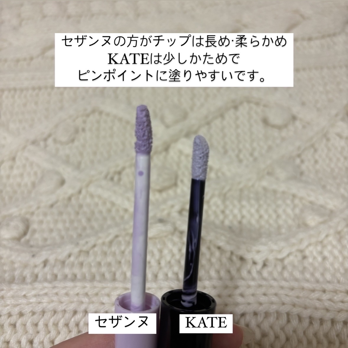 最近のプチプラの本気やばすぎない? プチプラ王者のセザンヌとケイトを徹底比較してみました🫶 淡色シャドウはセザンヌの方が全体に明るめ淡め、 ケイトの方がミュート感と繊細ラメの美しさが◎ 目元を明るくしたい場合はセザンヌ、 青み吸収対策的にはケイトの方がおすすめかも!