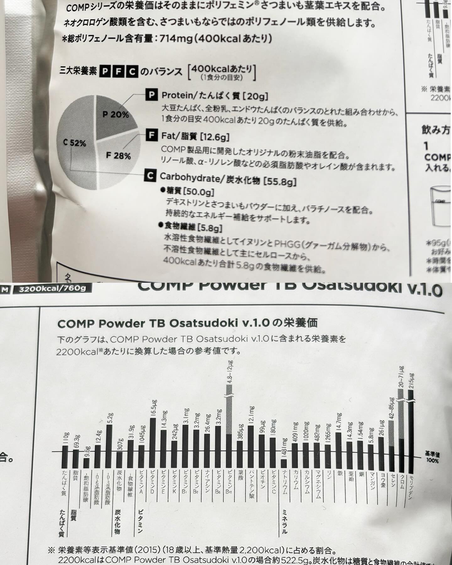 - 完全食*をコンセプトとして、厚生労働省「日本人の食事摂取基準(2020年版)」を参考に、三大栄養素「Protein(たんぱく質)」「Fat(脂質)」「Carbohydrate(炭水化物)」とビタミン・ミネラルをバランスよく含んだCOMPのトータルバランスドモデル(TB)パウダータイプ。 「さつまいものおいしさ、そのまま」でお馴染み、UHA味覚糖が誇る『おさつどきっ』とのコラボレーションが実現しました。『COMP』独自の栄養設計・品質に加え、『おさつどきっ』の美味しさをプラス。 三大栄養素(たんぱく質・脂質・炭水化物)・ビタミン・ミネラルなどの栄養素をトータルでバランスで良く摂取できるだけでなく、1袋(760g)あたり総ポリフェノール含有量 5,715mg、「ポリフェミン®さつまいも茎葉エキス」(ネオクロロゲン酸類を含むさつまいもならではのポリフェノール)を960mgもあわせて摂取できることが特徴です。