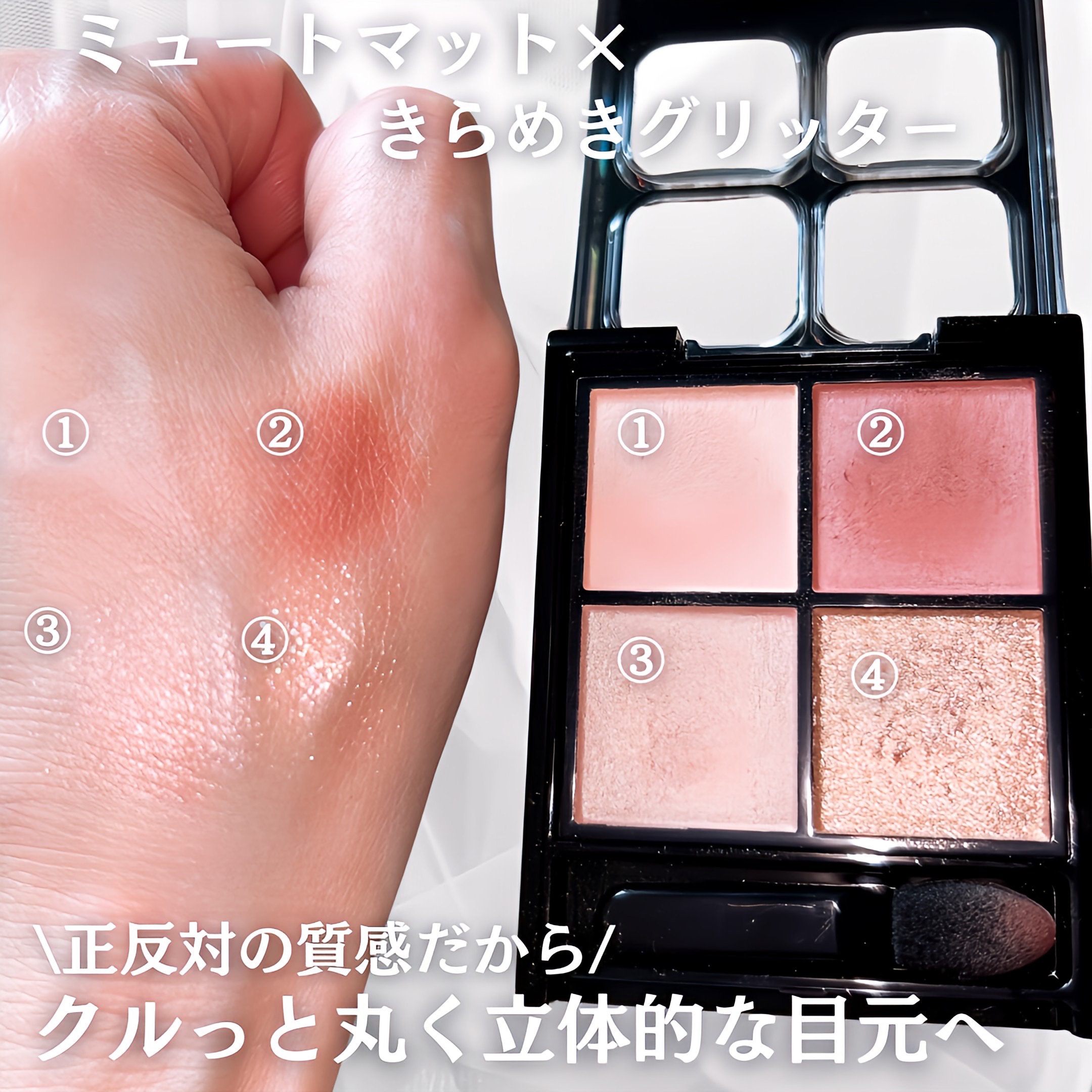目もとを灯す、火照りカラー 質感トリックシャドウ 限定色登場 ミューマット×クリアグリッター 正反対の2つのコントラストで、クリっと丸く、浮き出るような立体的な目もと印象へ 時間がない日でも簡単に可愛い目元になるのでついつい手にとってしまうアイテム