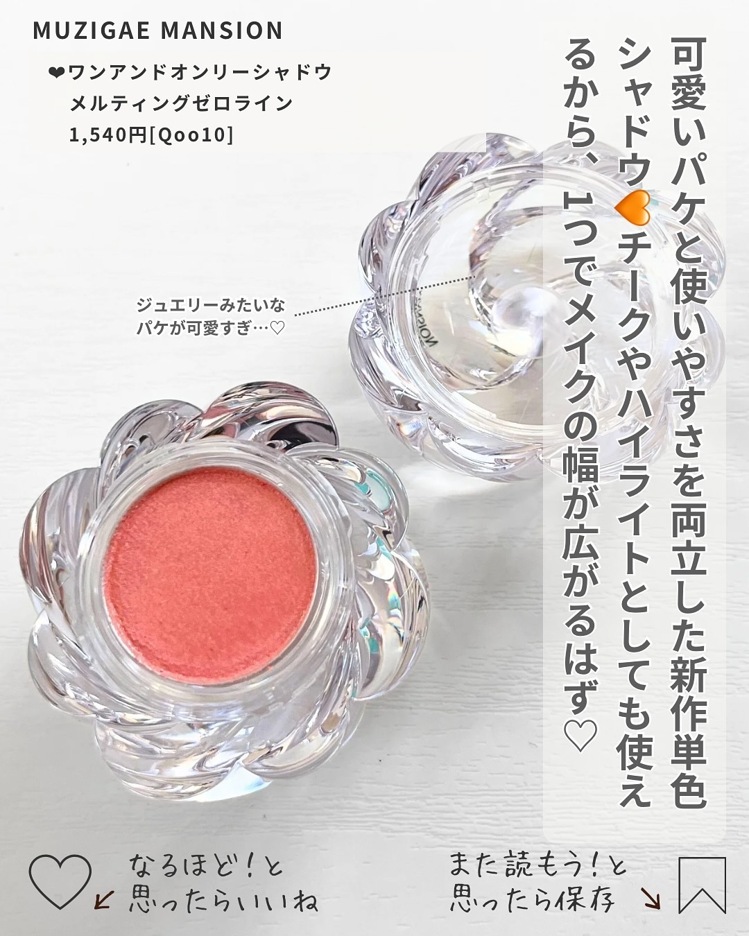 宝石の様なパケに使う度に胸が高鳴る🥹 芸術品の様な美しさ💎 唯一無二の斬新なパケデザインのムジゲマンション✨ まるで宝石の様なパケで開けた瞬間からトキメキがすごい…🥺💕 温かみのある優しいコーラルカラーに、同色の上品なラメが配合していて本当に可愛いカラー🥹