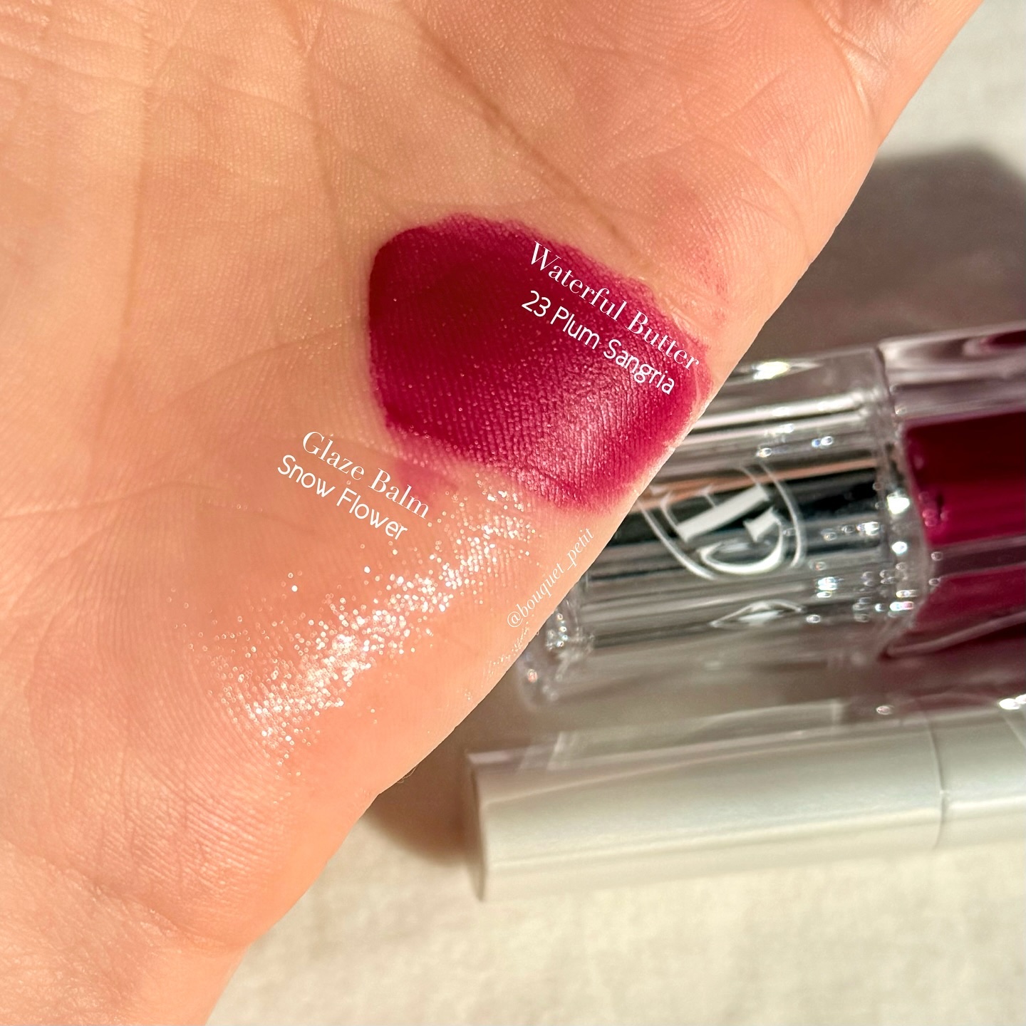 ウォータフルバター2色 グレーズバーム1色が出ました。 ほんとに不思議なのはみずみずしく塗れるのに塗って数秒経つとマットに変わること。 めちゃくちゃかわいいラメバーム!グレーズバームはトロトロテクスチャーなのにべたつかないのが好きです。