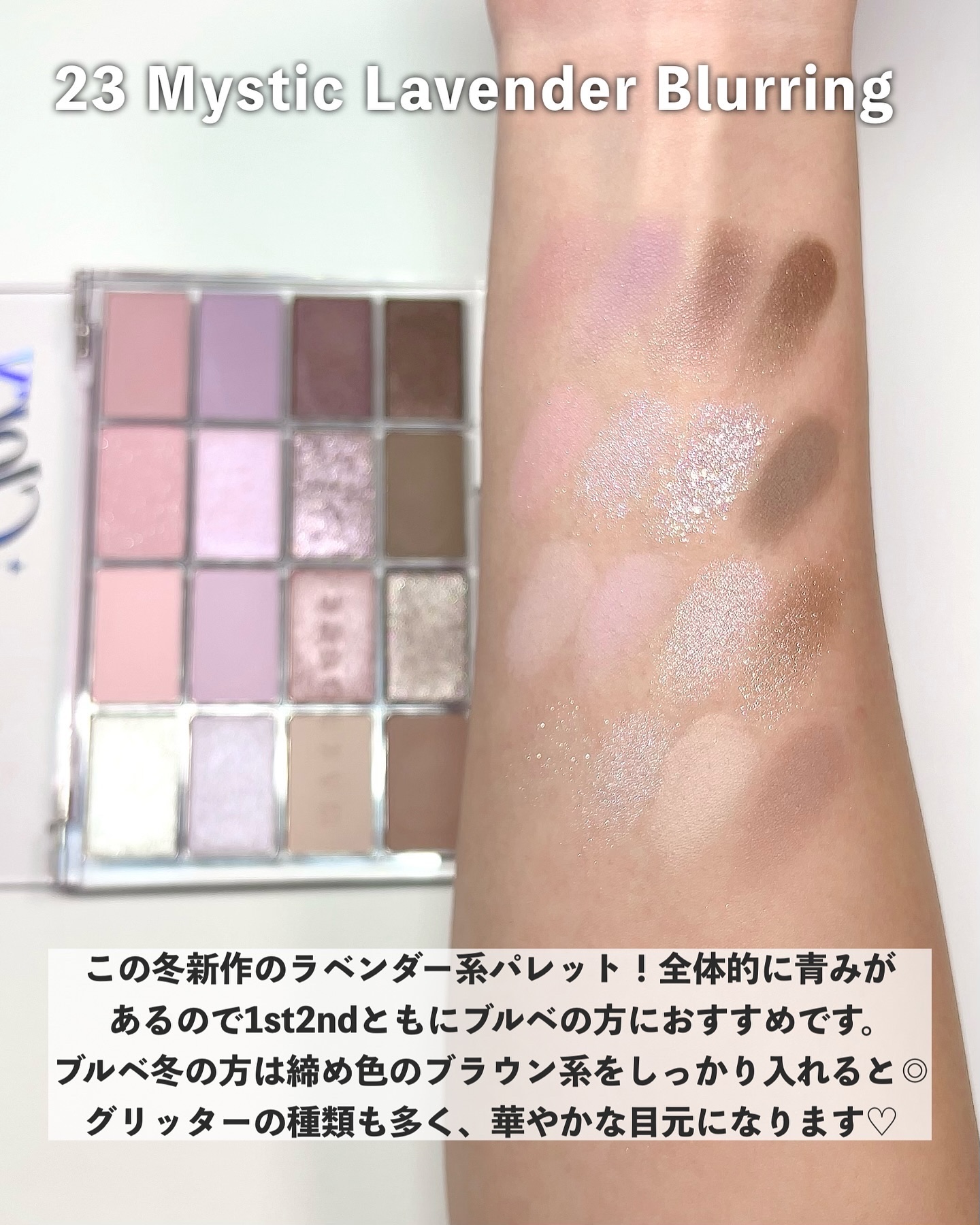 実物は想像以上に小さくて、持ち運びしやすいサイズ感! この小ささで8色も入っているので、旅行のお供にも最適です。 スウォッチしてみても、見た目通り使いやすい色味や質感が揃っています💓 パーソナルカラー別の解説もしていますので、ぜひ参考にしてください!