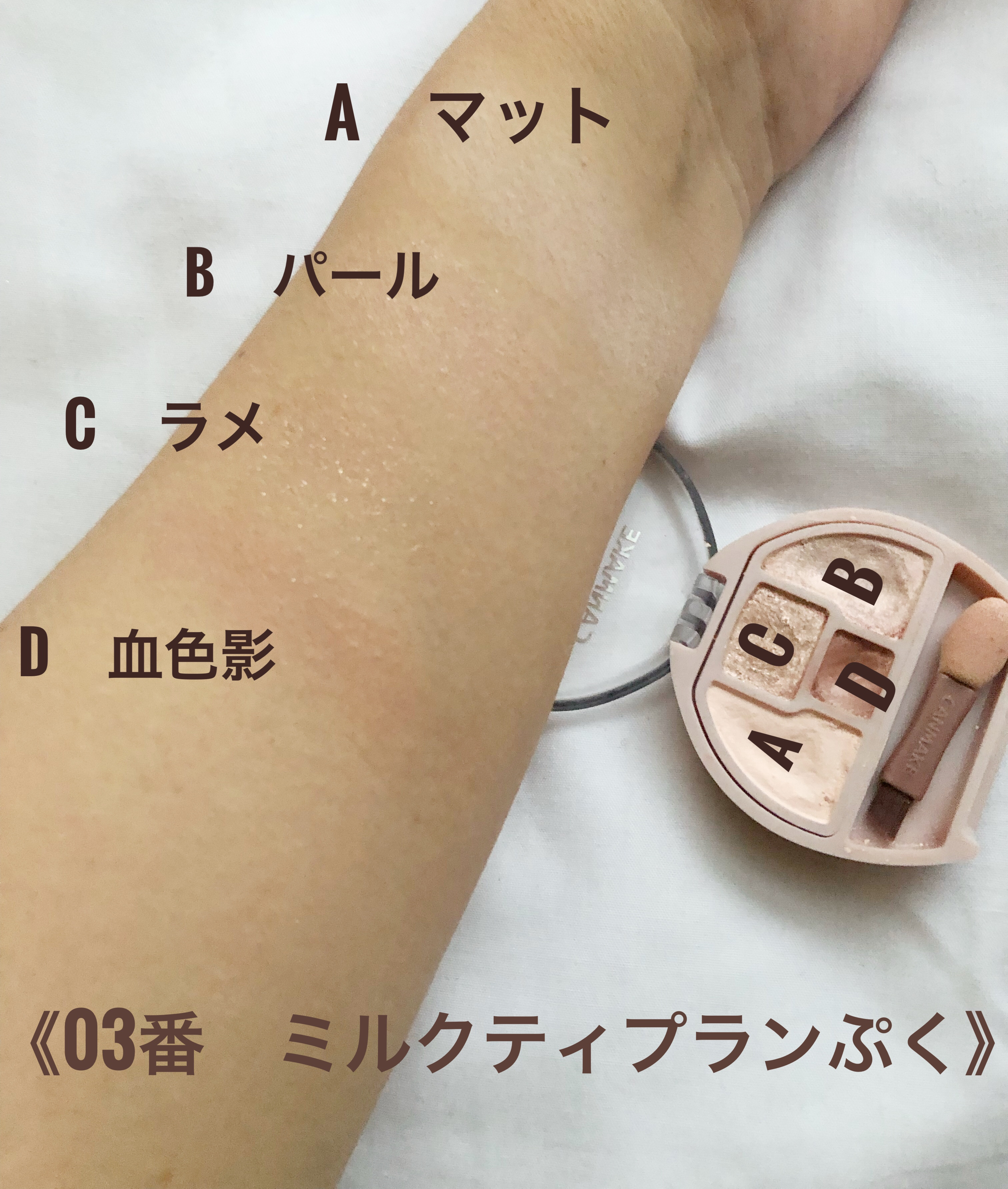 - <01 アプリコットプランぷく> 【A】合成フルオロフロゴパイト、窒化ホウ素、ステアリン酸エチルヘキシル、ジメチコン、ヘキサ(ヒドロキシステアリン酸/ステアリン酸/ロジン酸)ジペンタエリスリチル、シリカ、ジステアリン酸Al、クロルフェネシン、デヒドロ酢酸Na、水酸化Al、トコフェロール、セラミドNP、パルミチン酸レチノール、マイカ、酸化チタン、酸化鉄、赤226、グンジョウ 【B】トリ(カプリル酸/カプリン酸)グリセリル、合成フルオロフロゴパイト、ダイマージリノール酸ジ(イソステアリル/フィトステリル)、タルク、シリカ、ダイマージリノール酸ダイマージリノレイルビス(ベヘニル/イソステアリル/フィトステリル)、カルナウバロウ、クロルフェネシン、デヒドロ酢酸Na、トコフェロール、セラミドNP、パルミチン酸レチノール、マイカ、酸化チタン、酸化鉄、赤226、グンジョウ 【C】トリ(カプリル酸/カプリン酸)グリセリル、タルク、ダイマージリノール酸ジ(イソステアリル/フィトステリル)、ダイマージリノール酸ダイマージリノレイルビス(ベヘニル/イソステアリル/フィトステリル)、カルナウバロウ、シリカ、合成フルオロフロゴパイト、クロルフェネシン、デヒドロ酢酸Na、トコフェロール、セラミドNP、パルミチン酸レチノール、ホウケイ酸(Ca/Al)、マイカ、酸化チタン、酸化鉄、グンジョウ、黄4、赤226 【D】合成フルオロフロゴパイト、タルク、ジフェニルシロキシフェニルトリメチコン、窒化ホウ素、リンゴ酸ジイソステアリル、ミリスチン酸亜鉛、水添ポリイソブテン、ヘキサ(ヒドロキシステアリン酸/ステアリン酸/ロジン酸)ジペンタエリスリチル、クロルフェネシン、デヒドロ酢酸Na、トコフェロール、セラミドNP、パルミチン酸レチノール、マイカ、酸化鉄、酸化チタン、グンジョウ <02 サクラプランぷく> 【A】合成フルオロフロゴパイト、窒化ホウ素、ステアリン酸エチルヘキシル、ジメチコン、ヘキサ(ヒドロキシステアリン酸/ステアリン酸/ロジン酸)ジペンタエリスリチル、シリカ、ジステアリン酸Al、クロルフェネシン、デヒドロ酢酸Na、水酸化Al、トコフェロール、セラミドNP、パルミチン酸レチノール、マイカ、酸化チタン、酸化鉄、赤226、グンジョウ 【B】トリ(カプリル酸/カプリン酸)グリセリル、合成フルオロフロゴパイト、ダイマージリノール酸ジ(イソステアリル/フィトステリル)、タルク、シリカ、ダイマージリノール酸ダイマージリノレイルビス(ベヘニル/イソステアリル/フィトステリル)、カルナウバロウ、クロルフェネシン、デヒドロ酢酸Na、トコフェロール、セラミドNP、パルミチン酸レチノール、マイカ、酸化チタン、酸化鉄、グンジョウ、赤226 【C】トリ(カプリル酸/カプリン酸)グリセリル、タルク、ダイマージリノール酸ジ(イソステアリル/フィトステリル)、ダイマージリノール酸ダイマージリノレイルビス(ベヘニル/イソステアリル/フィトステリル)、カルナウバロウ、シリカ、合成フルオロフロゴパイト、クロルフェネシン、デヒドロ酢酸Na、トコフェロール、セラミドNP、パルミチン酸レチノール、ホウケイ酸(Ca/Al)、マイカ、酸化チタン、グンジョウ、酸化鉄、赤226 【D】タルク、合成フルオロフロゴパイト、ジフェニルシロキシフェニルトリメチコン、窒化ホウ素、リンゴ酸ジイソステアリル、ミリスチン酸亜鉛、水添ポリイソブテン、ヘキサ(ヒドロキシステアリン酸/ステアリン酸/ロジン酸)ジペンタエリスリチル、クロルフェネシン、デヒドロ酢酸Na、トコフェロール、セラミドNP、パルミチン酸レチノール、マイカ、酸化鉄、グンジョウ、赤226 <03 ミルクティプランぷく> 【A】合成フルオロフロゴパイト、窒化ホウ素、ステアリン酸エチルヘキシル、ジメチコン、ヘキサ(ヒドロキシステアリン酸/ステアリン酸/ロジン酸)ジペンタエリスリチル、シリカ、ジステアリン酸Al、クロルフェネシン、デヒドロ酢酸Na、水酸化Al、トコフェロール、セラミドNP、パルミチン酸レチノール、マイカ、酸化チタン、酸化鉄、赤226、グンジョウ 【B】トリ(カプリル酸/カプリン酸)グリセリル、合成フルオロフロゴパイト、ダイマージリノール酸ジ(イソステアリル/フィトステリル)、タルク、シリカ、ダイマージリノール酸ダイマージリノレイルビス(ベヘニル/イソステアリル/フィトステリル)、カルナウバロウ、クロルフェネシン、デヒドロ酢酸Na、トコフェロール、セラミドNP、パルミチン酸レチノール、マイカ、酸化チタン、酸化鉄、グンジョウ 【C】トリ(カプリル酸/カプリン酸)グリセリル、タルク、ダイマージリノール酸ジ(イソステアリル/フィトステリル)、ダイマージリノール酸ダイマージリノレイルビス(ベヘニル/イソステアリル/フィトステリル)、シリカ、カルナウバロウ、合成フルオロフロゴパイト、クロルフェネシン、デヒドロ酢酸Na、トコフェロール、セラミドNP、パルミチン酸レチノール、ホウケイ酸(Ca/Al)、マイカ、酸化チタン、酸化鉄、酸化スズ 【D】タルク、合成フルオ