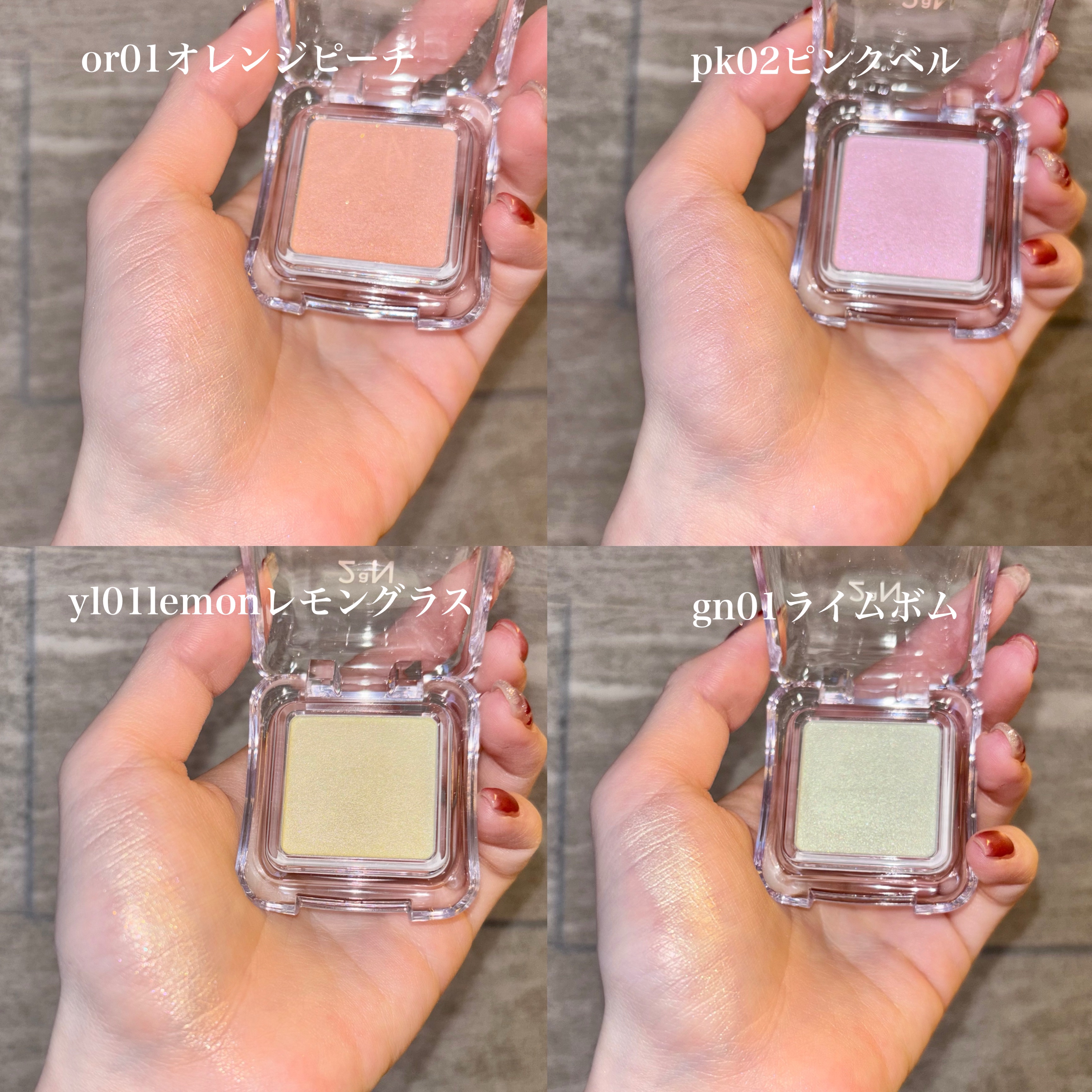 - <BL01ウェーブ> ジメチコン、酸化チタン、マイカ、合成フルオロフロゴパイト、メタクリル酸メチルクロスポリマー、ホウケイ酸(Ca/チタン)、(ビニルジメチコン/メチコンシルセスキオキサン)クロスポリマー、ジエチルヘキサン酸ネオペンチルグリコール、ラウロイルリシン、(ジメチコン/ビニルジメチコン)クロスポリマー、ミリスチン酸Mg、ナイロン-12、(セバシン酸/イソパルミチン酸)ジグリセリル、セスキイソステアリン酸ソルビタン、ヘキサ(ヒドロキシステアリン酸/ステアリン酸/ロジン酸)ジペンタエリスリチル、合成ワックス、フェノキシエタノール、プロパンジオール、グンジョウ、トリエトキシカプリリルシラン、酸化スズ、酸化鉄、トコフェロール <GN01 ライムボム> ジメチコン、酸化チタン、マイカ、合成フルオロフロゴパイト、メタクリル酸メチルクロスポリマー、(ジフェニルジメチコン/ビニルジフェニルジメチコン/シルセスキオキサン)クロスポリマー、ジエチルヘキサン酸ネオペンチルグリコール、ラウロイルリシン、(ジメチコン/ビニルジメチコン)クロスポリマー、ミリスチン酸Mg、ナイロン-12、(ビニルジメチコン/メチコンシルセスキオキサン)クロスポリマー、(セバシン酸/イソパルミチン酸)ジグリセリル、シリカ、ホウケイ酸(Ca/チタン)、セスキイソステアリン酸ソルビタン、ヘキサ(ヒドロキシステアリン酸/ステアリン酸/ロジン酸)ジペンタエリスリチル、メチルプロパンジオール、合成ワックス、プロパンジオール、酸化鉄、酸化クロム、トリエトキシカプリリルシラン、酸化スズ、コンジョウ、トコフェロール <ND01 シェル> ジメチコン、合成フルオロフロゴパイト、酸化チタン、メタクリル酸メチルクロスポリマー、(ビニルジメチコン/メチコンシルセスキオキサン)クロスポリマー、ジエチルヘキサン酸ネオペンチルグリコール、ラウロイルリシン、(ジメチコン/ビニルジメチコン)クロスポリマー、ミリスチン酸Mg、ナイロン-12、(セバシン酸/イソパルミチン酸)ジグリセリル、セスキイソステアリン酸ソルビタン、ヘキサ(ヒドロキシステアリン酸/ステアリン酸/ロジン酸)ジペンタエリスリチル、合成ワックス、フェノキシエタノール、プロパンジオール、トリエトキシカプリリルシラン、酸化鉄、酸化スズ、トコフェロール <ND02 クリア> ジメチコン、合成フルオロフロゴパイト、酸化チタン、メタクリル酸メチルクロスポリマー、マイカ、(ビニルジメチコン/メチコンシルセスキオキサン)クロスポリマー、ジエチルヘキサン酸ネオペンチルグリコール、ラウロイルリシン、(ジメチコン/ビニルジメチコン)クロスポリマー、ミリスチン酸Mg、ナイロン-12、(セバシン酸/イソパルミチン酸)ジグリセリル、セスキイソステアリン酸ソルビタン、ヘキサ(ヒドロキシステアリン酸/ステアリン酸/ロジン酸)ジペンタエリスリチル、合成ワックス、フェノキシエタノール、プロパンジオール、トリエトキシカプリリルシラン、酸化鉄、酸化スズ、赤226、グンジョウ、カルミン、トコフェロール <OR01 ピーチビーム> ジメチコン、マイカ、酸化チタン、合成フルオロフロゴパイト、メタクリル酸メチルクロスポリマー、ホウケイ酸(Ca/チタン)、ジエチルヘキサン酸ネオペンチルグリコール、(ビニルジメチコン/メチコンシルセスキオキサン)クロスポリマー、ラウロイルリシン、(ジメチコン/ビニルジメチコン)クロスポリマー、(ジフェニルジメチコン/ビニルジフェニルジメチコン/シルセスキオキサン)クロスポリマー、ミリスチン酸Mg、ナイロン-12、(セバシン酸/イソパルミチン酸)ジグリセリル、セスキイソステアリン酸ソルビタン、ヘキサ(ヒドロキシステアリン酸/ステアリン酸/ロジン酸)ジペンタエリスリチル、メチルプロパンジオール、合成ワックス、プロパンジオール、酸化鉄、酸化スズ、トリエトキシカプリリルシラン、カルミントコフェロール <PK01 マーメイド> ジメチコン、合成フルオロフロゴパイト、酸化チタン、メタクリル酸メチルクロスポリマー、ホウケイ酸(Ca/チタン)、(ビニルジメチコン/メチコンシルセスキオキサン)クロスポリマー、マイカ、ジエチルヘキサン酸ネオペンチルグリコール、ラウロイルリシン、(ジメチコン/ビニルジメチコン)クロスポリマー、ミリスチン酸Mg、ナイロン-12、(セバシン酸/イソパルミチン酸)ジグリセリル、セスキイソステアリン酸ソルビタン、ヘキサ(ヒドロキシステアリン酸/ステアリン酸/ロジン酸)ジペンタエリスリチル、合成ワックス、フェノキシエタノール、プロパンジオール、トリエトキシカプリリルシラン、酸化スズ、グンジョウ、酸化鉄、赤226、トコフェロール <PK02 ピンクベル> ジメチコン、合成フルオロフロゴパイト、酸化チタン、メタクリル酸メチルクロスポリマー、マイカ、ホウケイ酸(Ca/Al)、ジエチルヘキサン酸ネオペンチルグリコール、(ビニルジメチコン/メチコンシルセスキオキサン)クロスポリマー、ホウケイ酸(Ca/チタン)、ラウロイルリシン、(ジメチコン/ビ