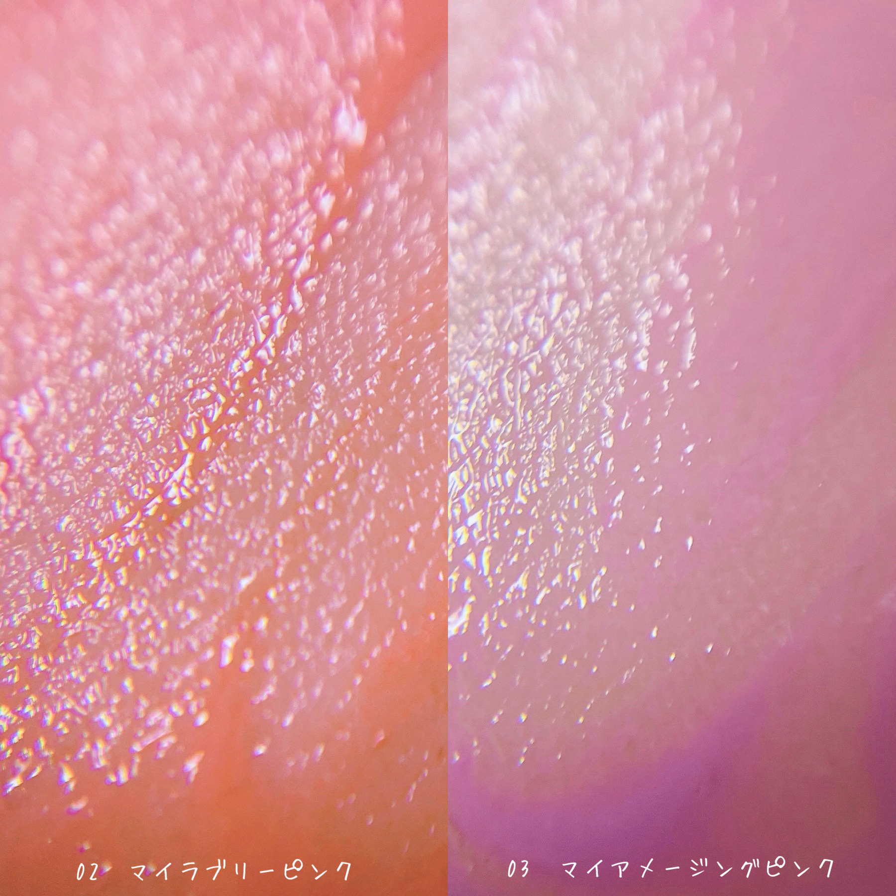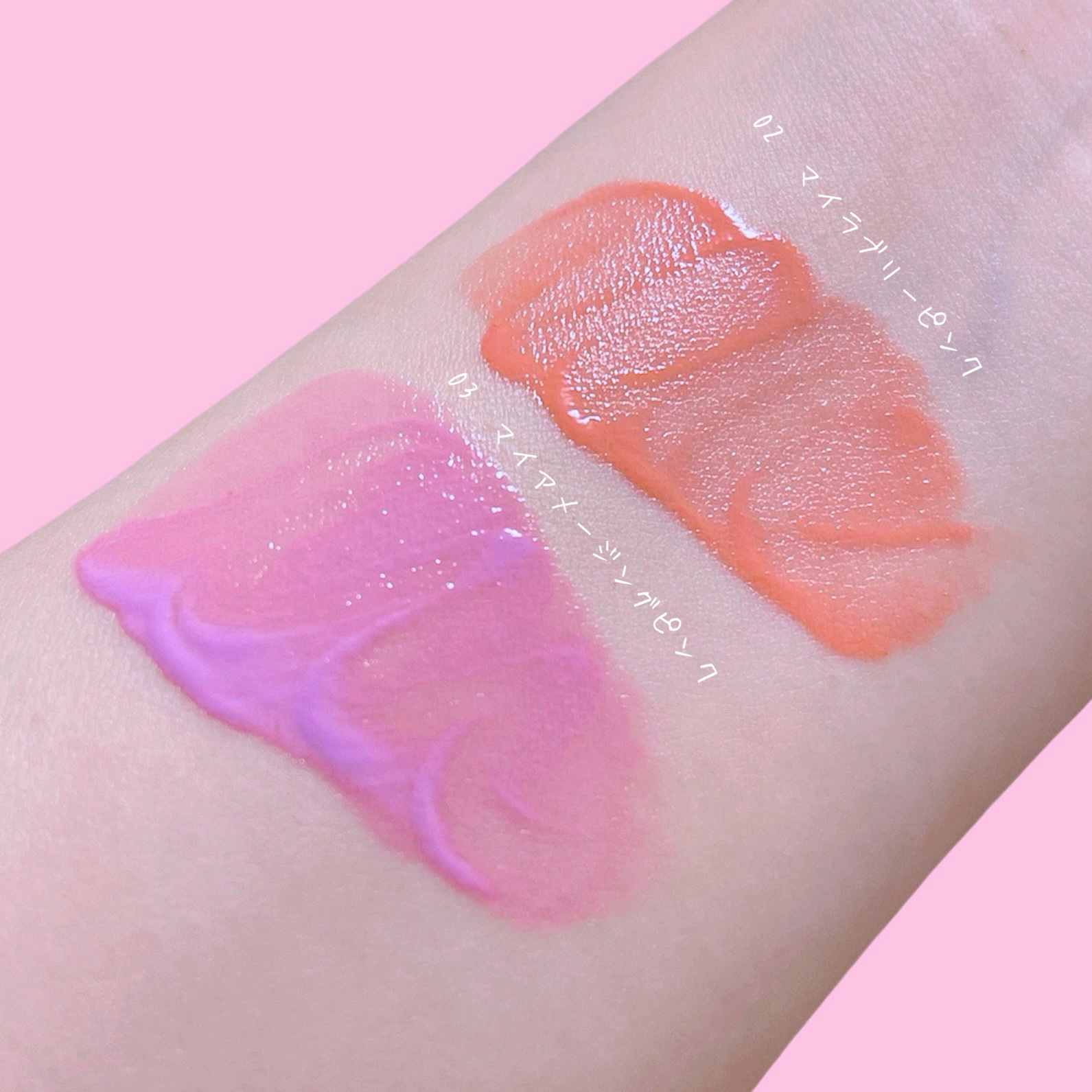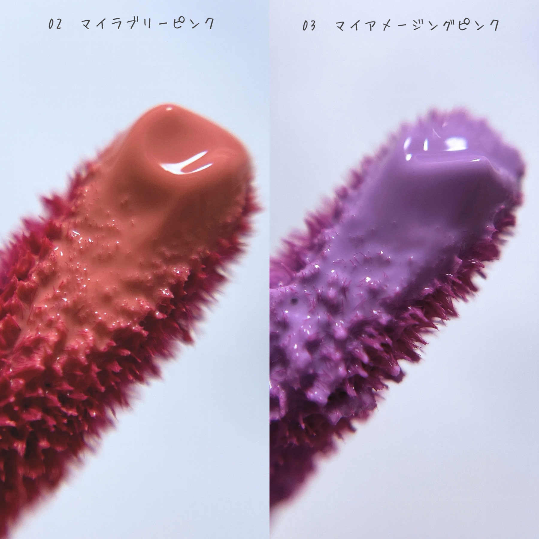 - <01 マイスイートピンク> 水、グリセリン、水添ポリイソブテン、BG、トリイソステアリン酸ポリグリセリル-2、プロパンジオール、酸化チタン、(アクリル酸Na/アクリロイルジメチルタウリンNa)コポリマー、1,2-ヘキサンジオール、ポリソルベート60、イソヘキサデカン、ビサボロール、酸化鉄、ポリソルベート80、エチルヘキシルグリセリン、オレイン酸ソルビタン、ポリアクリル酸アンモニウム、水酸化Al、(PEG-240/デシルテトラデセス-20/HDI)コポリマー、アデノシン、フェノキシエタノール、赤227、アンズ核油、月見草油、ツバキ種子油、センチフォリアバラ花エキス、ポリアクリレートクロスポリマー-6、ラウリン酸K、トコフェロール <02 マイラブリーピンク> 水、グリセリン、水添ポリイソブテン、BG、トリイソステアリン酸ポリグリセリル-2、プロパンジオール、(アクリル酸Na/アクリロイルジメチルタウリンNa)コポリマー、ポリソルベート80、1,2-ヘキサンジオール、酸化チタン、イソヘキサデカン、ビサボロール、酸化鉄、エチルヘキシルグリセリン、オレイン酸ソルビタン、(PEG-240/デシルテトラデセス-20/HDI)コポリマー、アデノシン、ポリアクリル酸アンモニウム、水酸化Al、赤227、フェノキシエタノール、月見草油、ツバキ種子油、アンズ核油、センチフォリアバラ花エキス、黄4、ポリアクリレートクロスポリマー-6、ラウリン酸K、トコフェロール、青1 <03 マイアメージングピンク> 水、グリセリン、水添ポリイソブテン、BG、トリイソステアリン酸ポリグリセリル-2、プロパンジオール、(アクリル酸Na/アクリロイルジメチルタウリンNa)コポリマー、ポリソルベート80、1,2-ヘキサンジオール、イソヘキサデカン、酸化チタン、ビサボロール、エチルヘキシルグリセリン、オレイン酸ソルビタン、(PEG-240/デシルテトラデセス-20/HDI)コポリマー、アデノシン、水酸化Al、ポリアクリル酸アンモニウム、赤104(1)、赤227、フェノキシエタノール、青1、ツバキ種子油、月見草油、アンズ核油、センチフォリアバラ花エキス、ポリアクリレートクロスポリマー-6、ラウリン酸K、トコフェロール