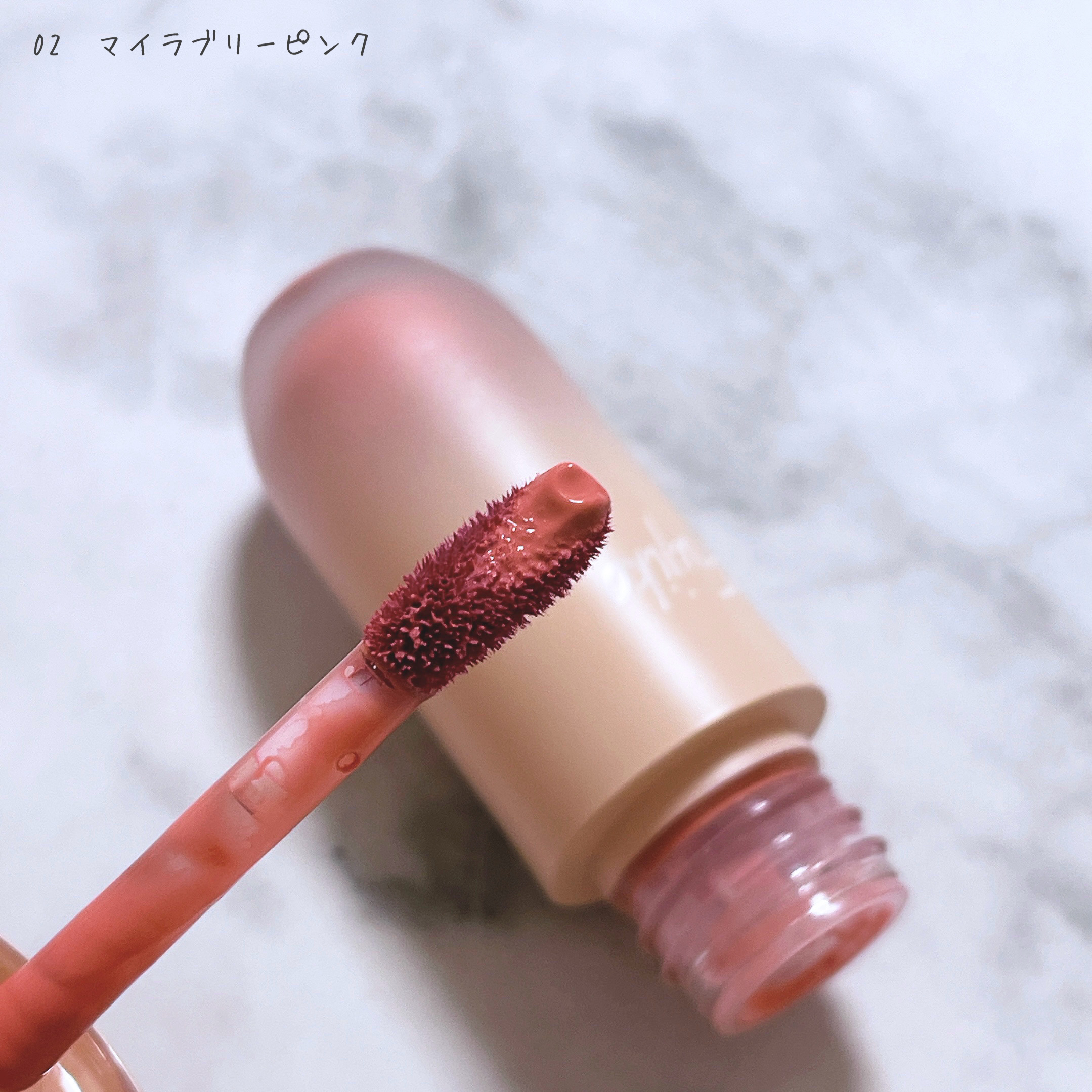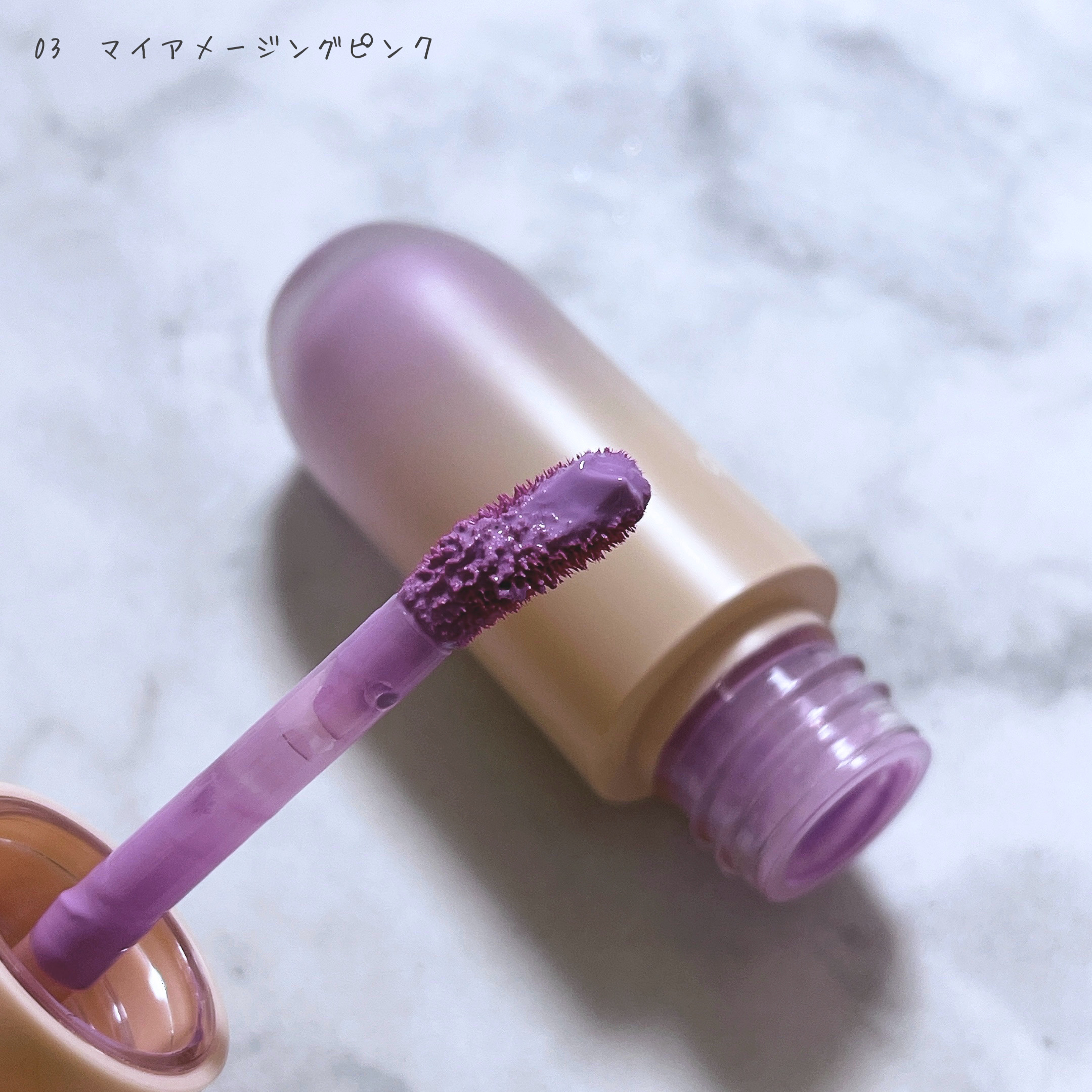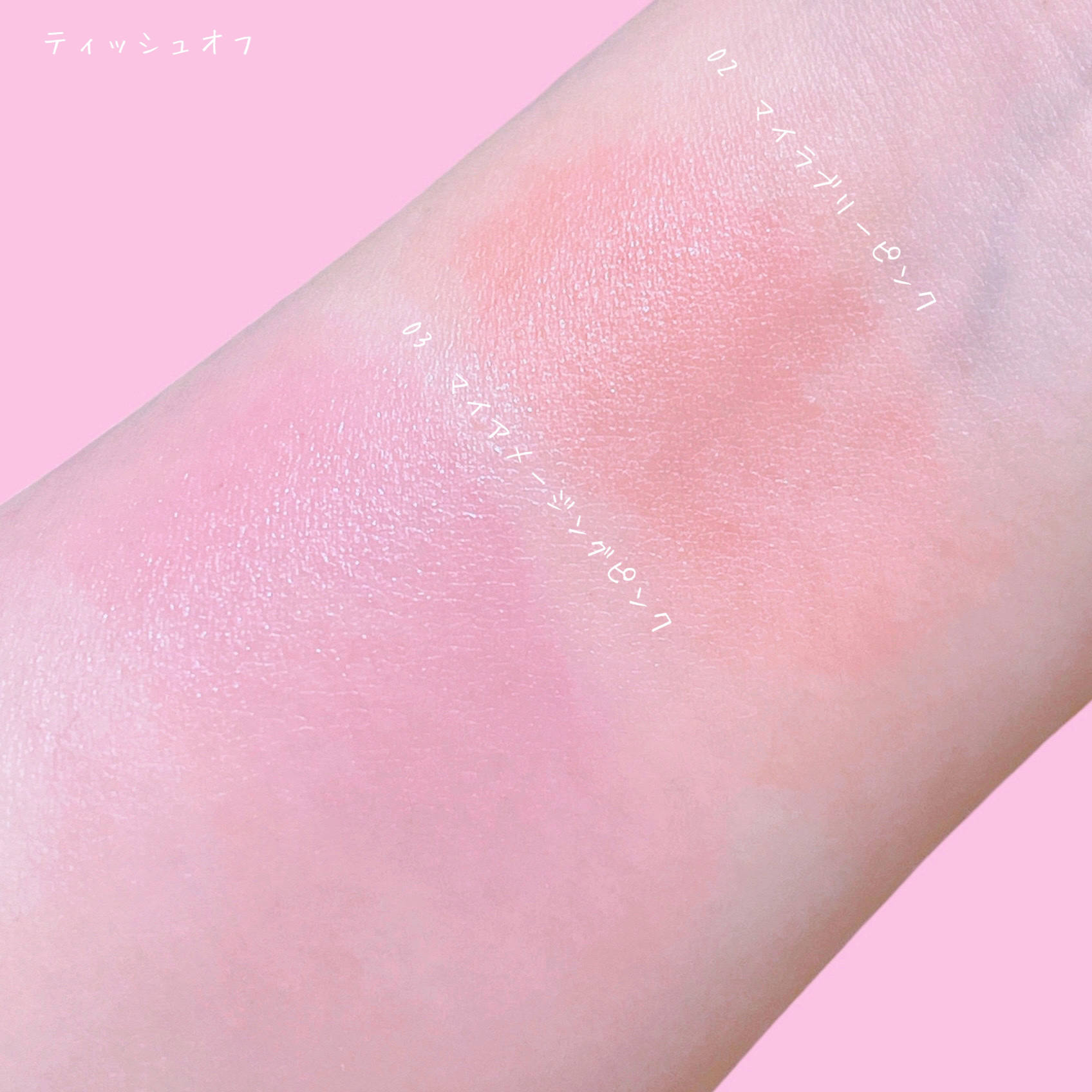 - <01 マイスイートピンク> 水、グリセリン、水添ポリイソブテン、BG、トリイソステアリン酸ポリグリセリル-2、プロパンジオール、酸化チタン、(アクリル酸Na/アクリロイルジメチルタウリンNa)コポリマー、1,2-ヘキサンジオール、ポリソルベート60、イソヘキサデカン、ビサボロール、酸化鉄、ポリソルベート80、エチルヘキシルグリセリン、オレイン酸ソルビタン、ポリアクリル酸アンモニウム、水酸化Al、(PEG-240/デシルテトラデセス-20/HDI)コポリマー、アデノシン、フェノキシエタノール、赤227、アンズ核油、月見草油、ツバキ種子油、センチフォリアバラ花エキス、ポリアクリレートクロスポリマー-6、ラウリン酸K、トコフェロール <02 マイラブリーピンク> 水、グリセリン、水添ポリイソブテン、BG、トリイソステアリン酸ポリグリセリル-2、プロパンジオール、(アクリル酸Na/アクリロイルジメチルタウリンNa)コポリマー、ポリソルベート80、1,2-ヘキサンジオール、酸化チタン、イソヘキサデカン、ビサボロール、酸化鉄、エチルヘキシルグリセリン、オレイン酸ソルビタン、(PEG-240/デシルテトラデセス-20/HDI)コポリマー、アデノシン、ポリアクリル酸アンモニウム、水酸化Al、赤227、フェノキシエタノール、月見草油、ツバキ種子油、アンズ核油、センチフォリアバラ花エキス、黄4、ポリアクリレートクロスポリマー-6、ラウリン酸K、トコフェロール、青1 <03 マイアメージングピンク> 水、グリセリン、水添ポリイソブテン、BG、トリイソステアリン酸ポリグリセリル-2、プロパンジオール、(アクリル酸Na/アクリロイルジメチルタウリンNa)コポリマー、ポリソルベート80、1,2-ヘキサンジオール、イソヘキサデカン、酸化チタン、ビサボロール、エチルヘキシルグリセリン、オレイン酸ソルビタン、(PEG-240/デシルテトラデセス-20/HDI)コポリマー、アデノシン、水酸化Al、ポリアクリル酸アンモニウム、赤104(1)、赤227、フェノキシエタノール、青1、ツバキ種子油、月見草油、アンズ核油、センチフォリアバラ花エキス、ポリアクリレートクロスポリマー-6、ラウリン酸K、トコフェロール