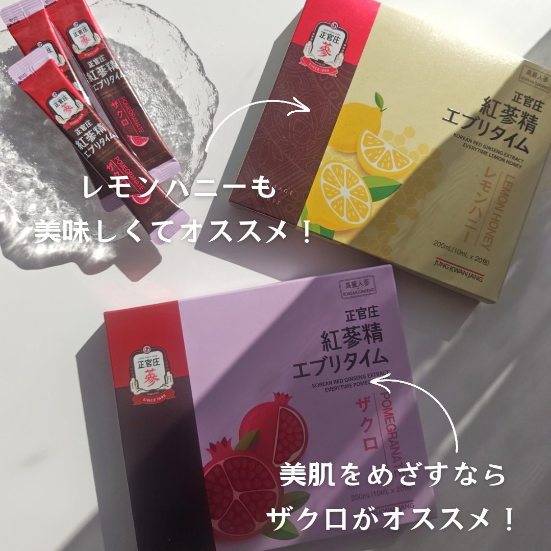 活動と休息のバランスを整える成分が豊富に含まれた高麗人参を日常的に飲みやすくしたもので、全世界で売れているロングセラーブランドなのでどこかで見たことある人も多いのではないでしょうか😊 こちらはシリーズの中でも1番苦味が控えめなので美味しく続けやすいかと思います🥕🔰 濃くてしっかり摂り入れてる実感がありますよ🎶 ザクロ味は濃厚なプルーンに近いかな。甘みと酸味のバランスがよく紅参特有の匂いも抑えられているかと思います。
