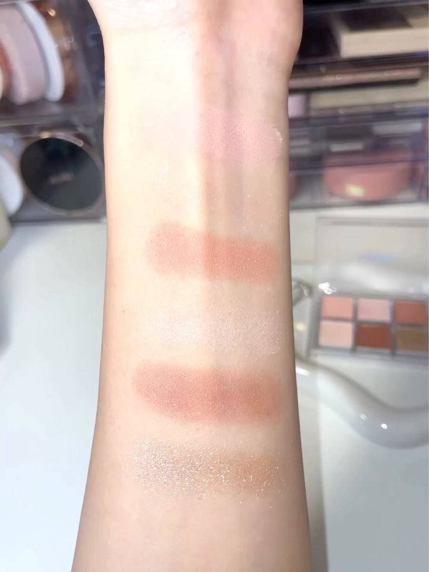 しっとりとした粉質アイシャドウで密着感がしっかりしてて粉飛びゼロ!! 高輝度で濡れツヤ感を演出♡ 全体的に黄み寄りの落ち着いた大人ベージュブラウン🩶 チークカラーもついてるから、塗るとメイクの統一感がでて一気にこなれ感💓