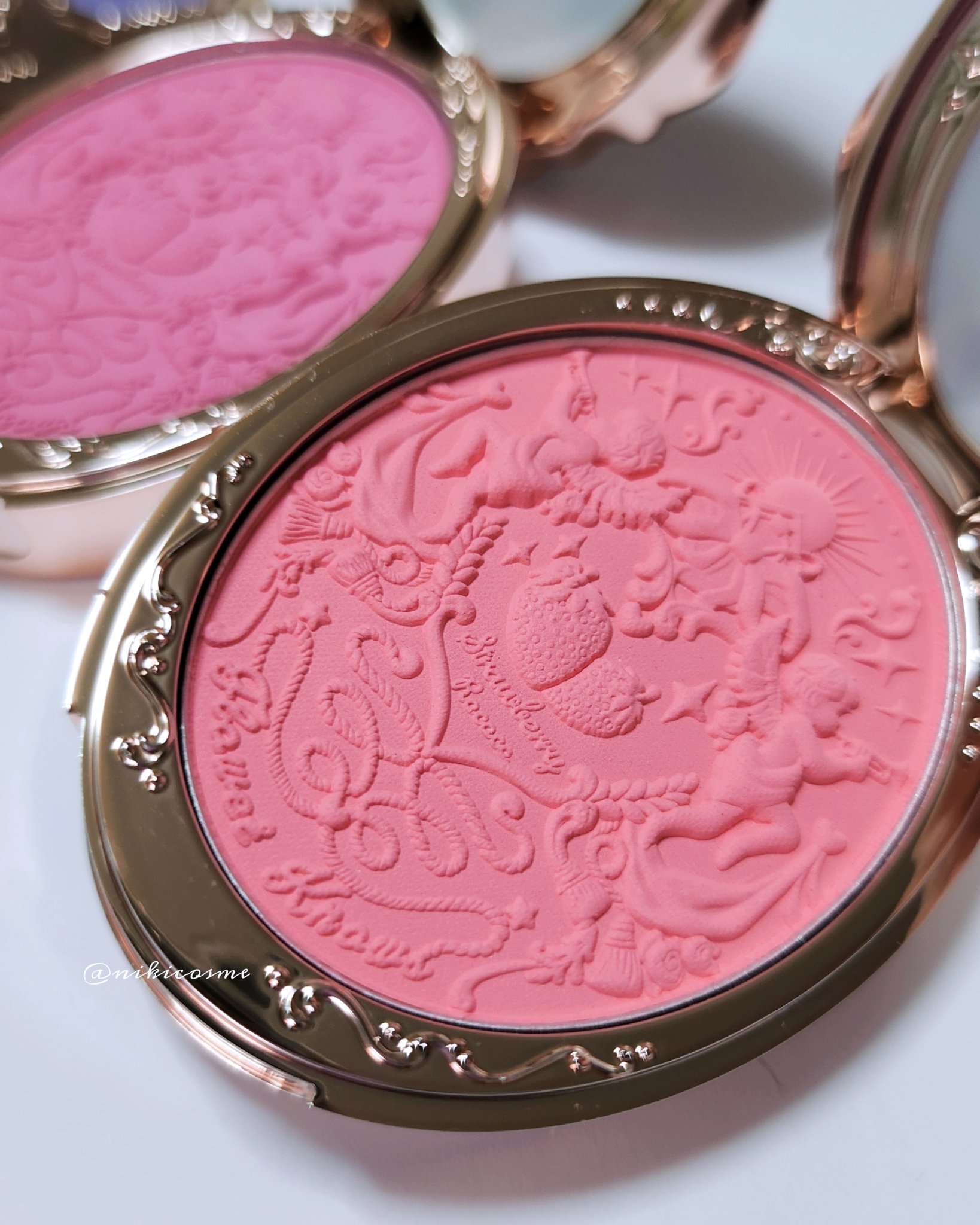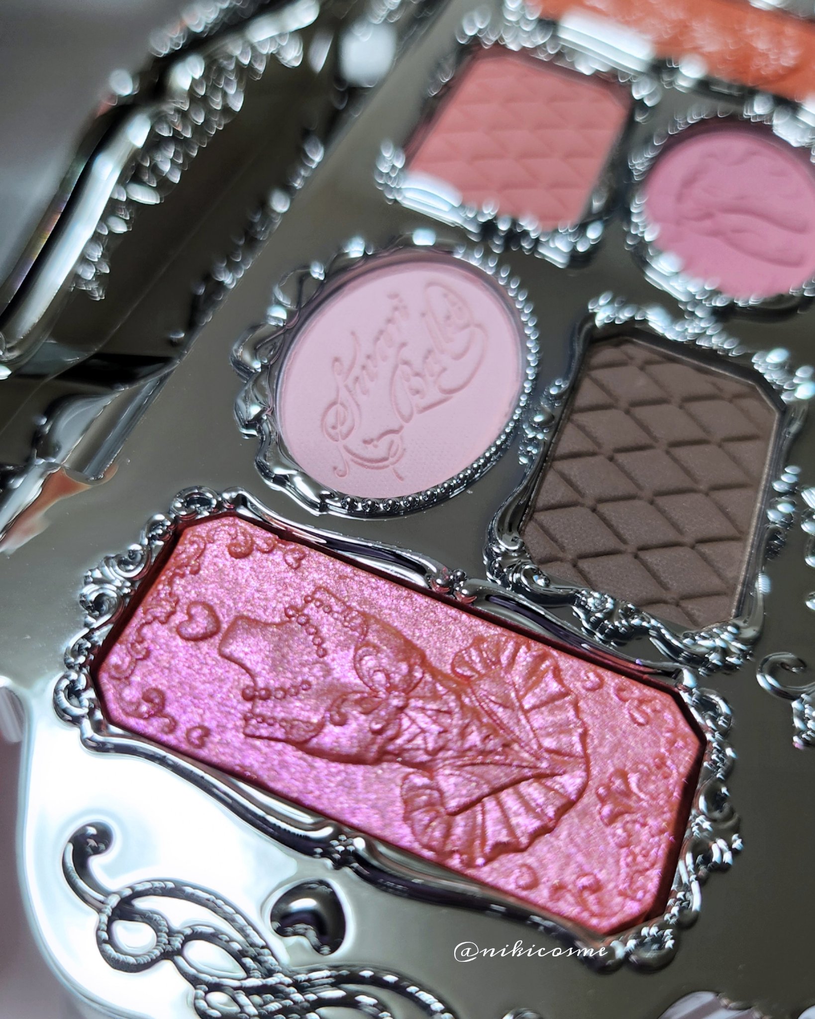 白鳥の刻印が可愛すぎて✨ 使ってるうちになくなっちゃうんですが、気分は上がる↑↑ 粉質はしっとりしていて、 見た目はっきりしたカラーですが、つける前にブラシの余分な粉落としてからつけたら濃すぎないしふんわり仕上がります💕 何より他に類を見ないパケのかわいさがあるので気になる方はぜひ!!