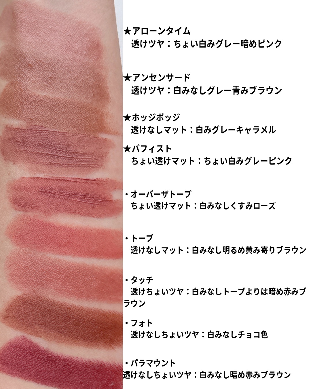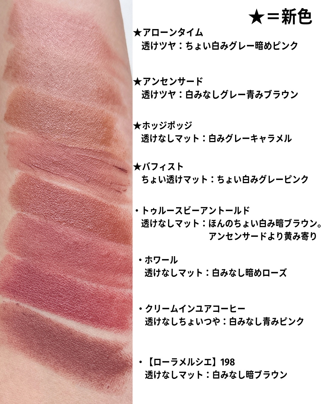新色の00.5Nも買ってスウォッチしたぜ! 一部リニューアル前のもの含むけど、BAさんに聞いたらリニューアル後で色が変わってるとかはないとの事でした。 ブログの方が画質良くて実際の色に近いからみてみてね👍🏻