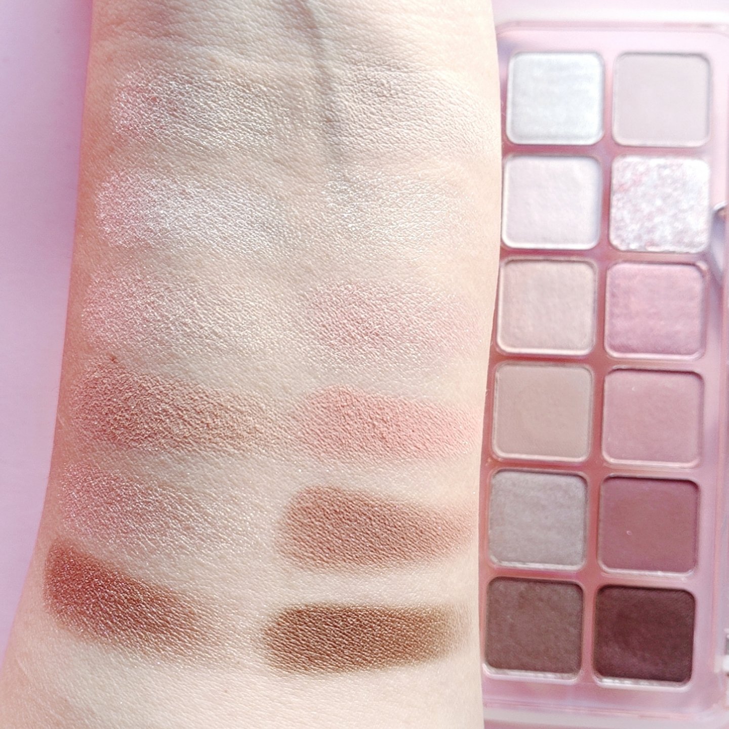 プチプラのクオリティじゃないっ!! 発売前からチェックしていたけれど、ここまで可愛いとは…😆 絶妙カラーで目もとのくすみを飛ばして*明るい印象に🩷 横割りグラデーションでメイクし、立体感をより出したかったので最後に1番左のカラーを上まぶたの真ん中と涙袋にのせています🙆 肌馴染みも良くて粉飛びも感じにくかったです💕 ブラウンの方も店頭に出てたら買おうかな💓