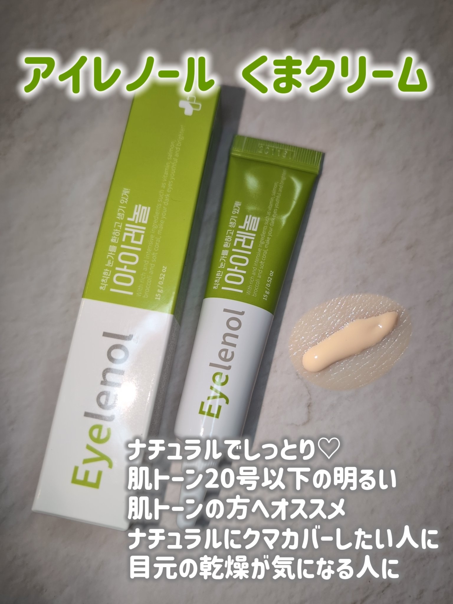 韓国で話題! コンシーラー機能もそなえたアイクリーム! アイクリームのようなしっとりしたテクスチャーで、保湿力があるため乾燥しにくいです。 クマクリームなので、パサパサしたりもしませんし、メイク時、メイク後に使えるのもいいなぁと思いました。