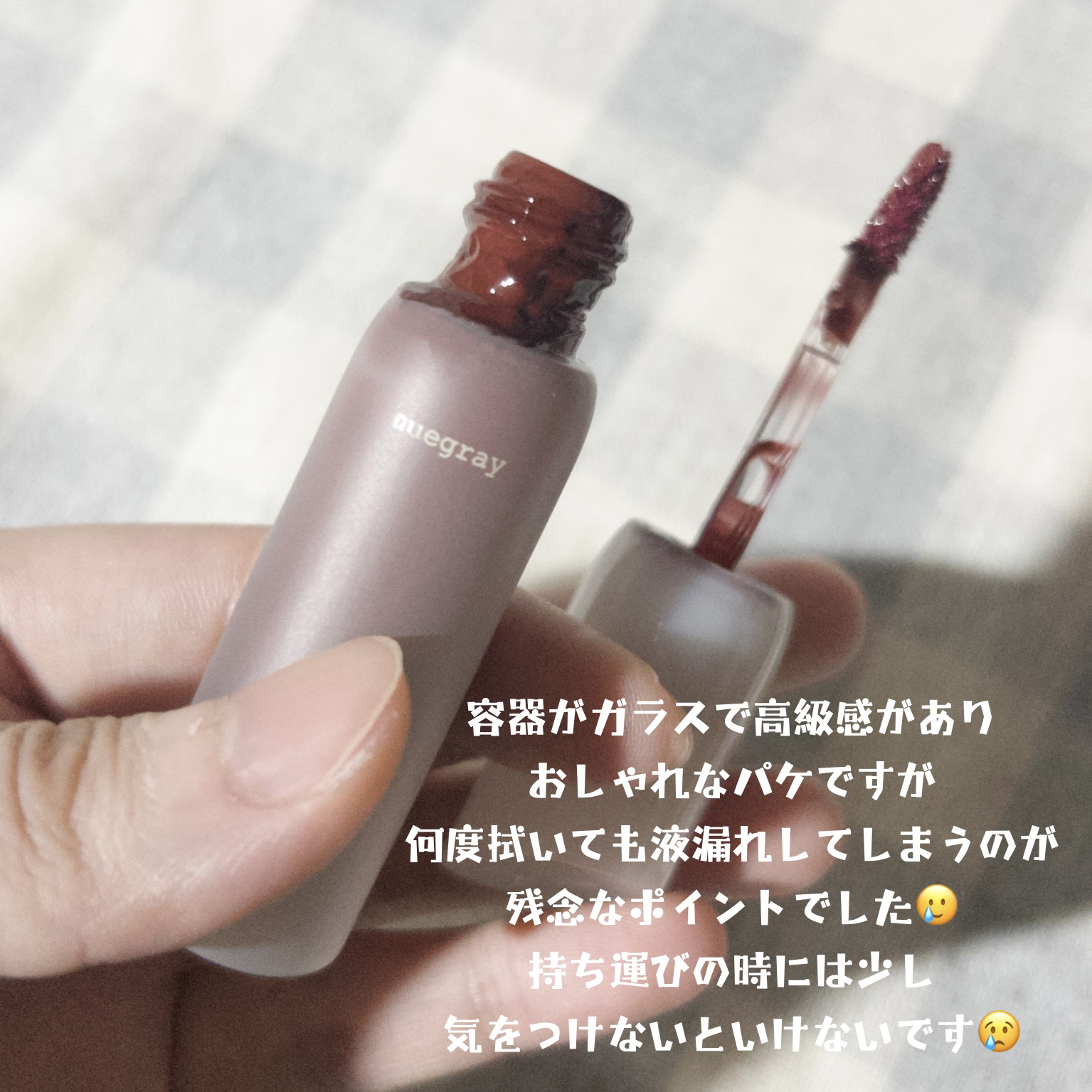 - ヌグレイらしい光を出すティントシリーズ2番目のコレクション ヌグローウィリキッドは唇の上に薄い水の光を載せたようなはじけるツヤ感がポイントです。 45%以上の水分が配合されており、唇をしっとり輝かせ、 べたつかないテクスチャーで鏡を見なくてもサラリと唇に密着します。デイリー使いもできる便利な8カラーで構成されていて、最初の色彩そのままを長時間維持させることができます。 夏に向けて清々しい光を放つ唇に微かな活気が表れるリップです。