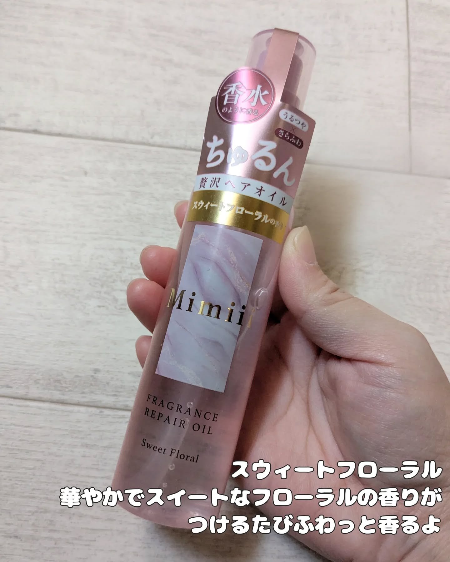香水代わりに使えるうるつやヘアオイル🤍🫧 10種類の植物エキス*とケラチンの補修成分配合でうるおいのあるちゅるんとした髪へ✨ サラッとしたヘアオイルでベタつかず 軽いつけ心地だから重い仕上がりが苦手の方にオススメだよ! スウィートフローラル🌸は華やかなフローラル系で ピュアサボン🧼は清潔感のある石鹸の香り♪