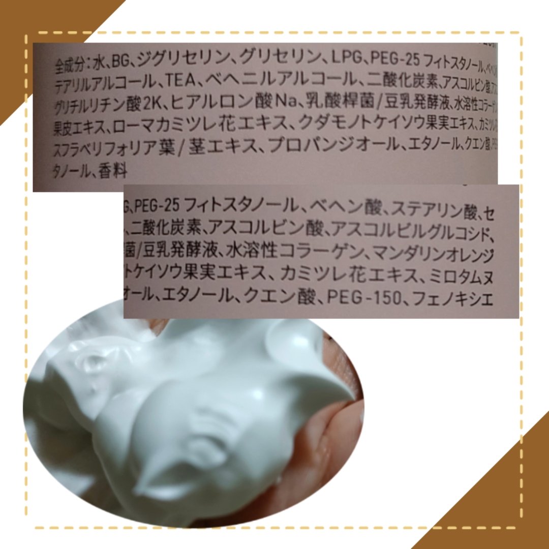 - <120g> 水、ベヘニルアルコール、BG、グリセリン、ジグリセリン、ヒアルロン酸Na、PEG-150、フェノキシエタノール、香料、水溶性コラーゲン、エタノール、グリチルリチン酸2K、ステアリン酸、マンダリンオレンジ果皮エキス、プロパンジオール、TEA、セテアリルアルコール、カミツレ花エキス、アスコルビン酸、クエン酸、ローマカミツレ花エキス、クダモノトケイソウ果実エキス、アスコルビルグルコシド、LPG、ベヘン酸、二酸化炭素、PEG-25フィトスタノール、乳酸桿菌/豆乳発酵液、ミロタムヌスフラベリフォリア葉/茎エキス