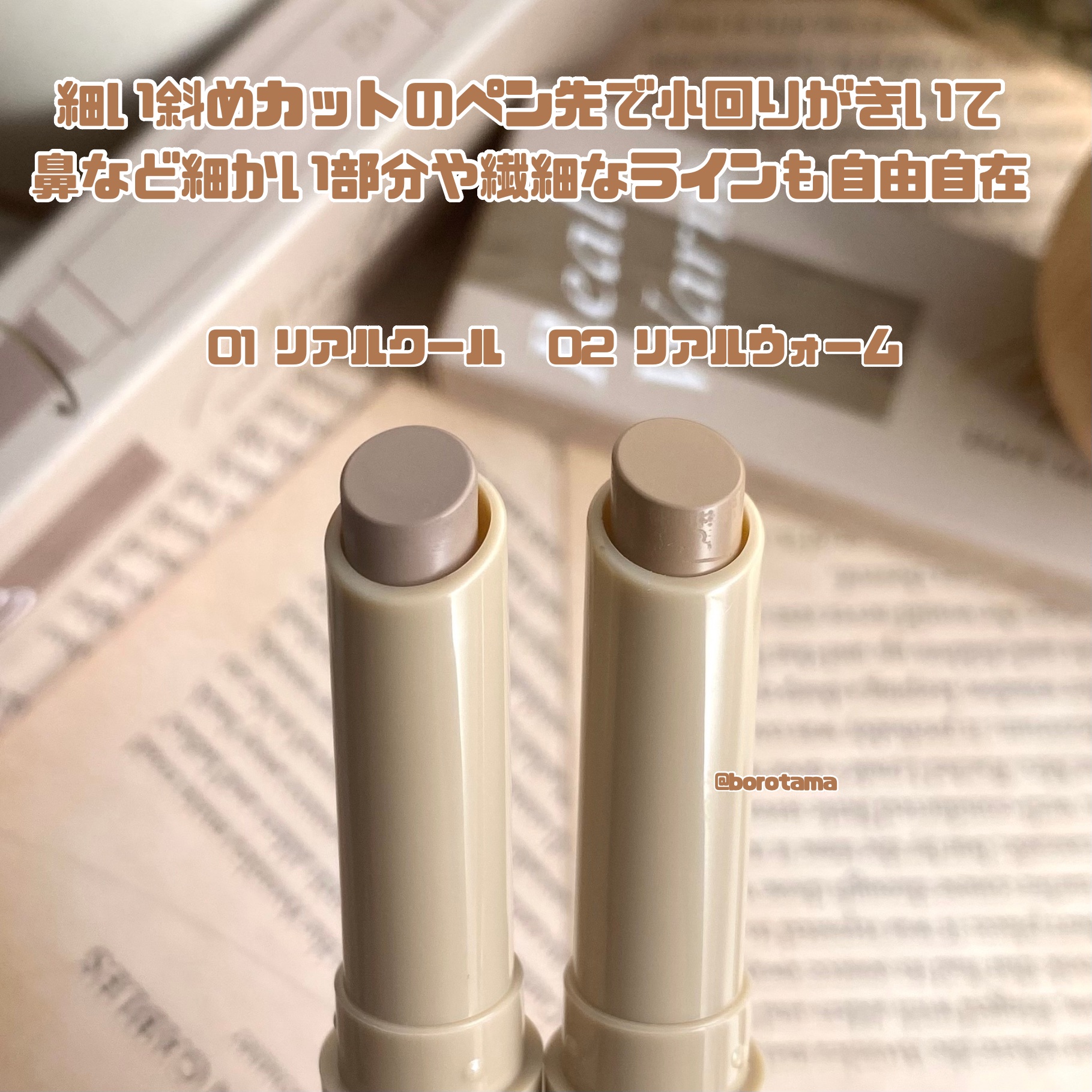 - 簡単ひと塗りで、理想のフェイスラインへ 粉っぽさを感じさせないテクスチャーで自然な影を演出し、ベタつかず快適な使い心地のコントゥアペン。 保湿成分配合で乾燥も防ぎ、仕上がりはパウダリーでなめらか。 細い斜めカットのペン先が小回り抜群で、初心者でも使いやすく、細かい部分や繊細なラインも自由自在に描けます。 さらに、付属のミニパフを使えば、ぼかしも簡単に仕上がります。 これ1本でプロのような立体感を手軽に手に入れられる優秀アイテムです。 01 リアルクール グレーっぽいカラーがブルベさん向きで、肌になじみやすく自然な立体感を演出。 02 リアルウォーム 肌なじみのよい淡く柔らかいブラウンカラーでイエベさんにぴったりのカラーです。