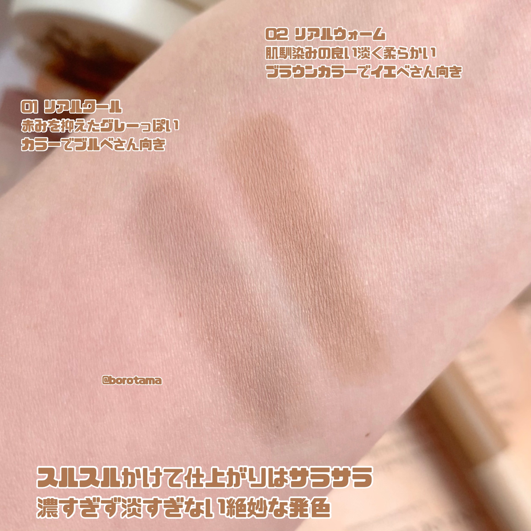 - <01 リアルクール> パルミチン酸エチルヘキシル、(C15-19)アルカン、シリカ、トリ(カプリル酸/カプリン酸)グリセリル、合成ワックス、水添マイクロクリスタリンワックス、(HDI/トリメチロールヘキシルラクトン)クロスポリマー、酸化チタン、セチルPEG/PPG-10/1ジメチコン、酸化鉄、(VP/ヘキサデセン)コポリマー、ジステアルジモニウムヘクトライト、フェノキシエタノール、酢酸トコフェロール、水酸化Al、メチコン、エチルヘキシルグリセリン <02 リアルウォーム> パルミチン酸エチルヘキシル、(C15-19)アルカン、シリカ、トリ(カプリル酸/カプリン酸)グリセリル、合成ワックス、酸化チタン、水添マイクロクリスタリンワックス、(HDI/トリメチロールヘキシルラクトン)クロスポリマー、酸化鉄、セチルPEG/PPG-10/1ジメチコン、(VP/ヘキサデセン)コポリマー、ジステアルジモニウムヘクトライト、フェノキシエタノール、酢酸トコフェロール、エチルヘキシルグリセリン