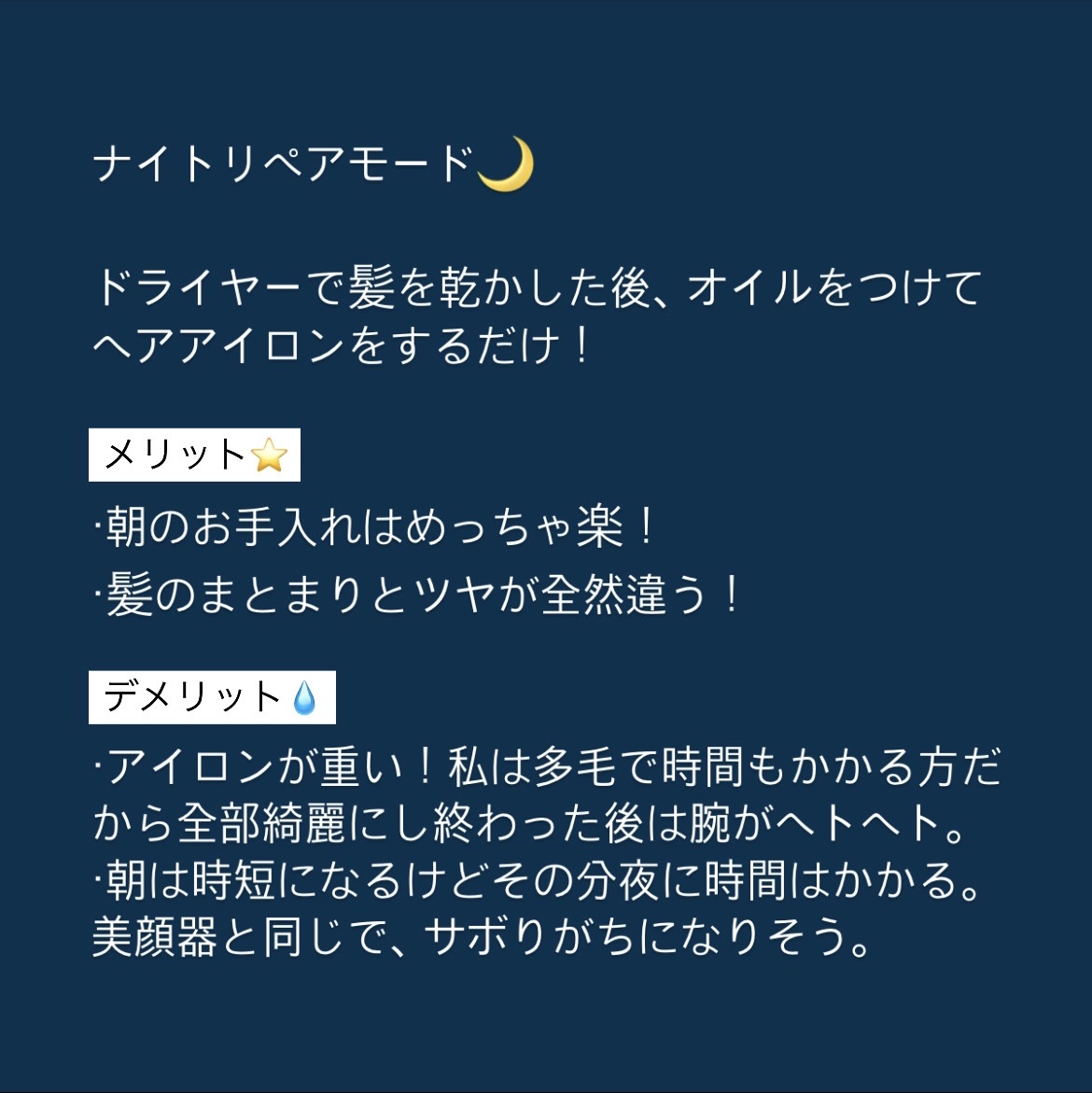 - ヘアドライ後のワンステップで、朝が、髪の質感が変わる。 辿り着いた新習慣「夜アイロン」 ヤーマン独自の低温×超音波テクノロジーで夜のうちに、髪の浸透補修をサポートしながら毛流れを整える。“髪にも美顔器”発想で誕生した、ヘアケアの新習慣「夜アイロン」。 朝が、髪の質感が変わる新習慣「夜アイロン」 スタイリング、湿気、洗髪、ブラッシング… 生活の中で受ける髪ダメージは意外と多いもの。 また、ドライヤーだけで取り切れないクセがあると感じる方は、 なんと約80%※も。 そんなお悩みに応え、 1台で浸透補修×クセ伸ばしをサポートするのが夜アイロン。 ヘアドライ後の仕込みケアで、扱いやすい髪へ。 一日の終わりに、受けた髪ダメージをケアし、 ヘアドライ後の毛流れを整える。 新習慣「夜アイロン」を始めませんか? ※「ヘアケアに関する調査」調査手法:インターネットリサーチ 調査期間:2024年3月15日~3月21日 対象者:全国20-50代女性。髪悩みあり・ヘアケア関心層かつヘアドライを行う方(n=360) ■製品仕様 定格電源:DC12V 4.0A 消費電力:充電時15W、アダプタ駆動時40W サイズ:約50mm×51mm×295mm( W×D×H) 質量:約485g 設定温度: ディープトリートメントモード 50℃ ナイトリペアモード 90℃ ストレートモード 140℃~180 ℃( 20℃刻みの3段階) 材質: PPS+GF、PA+GF、PET+GF、ポリカーボネート、ABS樹脂、ステンレス、アルミ、シリコン 付属品: ストラップ 1個 A Cアダプター 1個 取扱説明書( 保証書付) 型番:YJHB4L