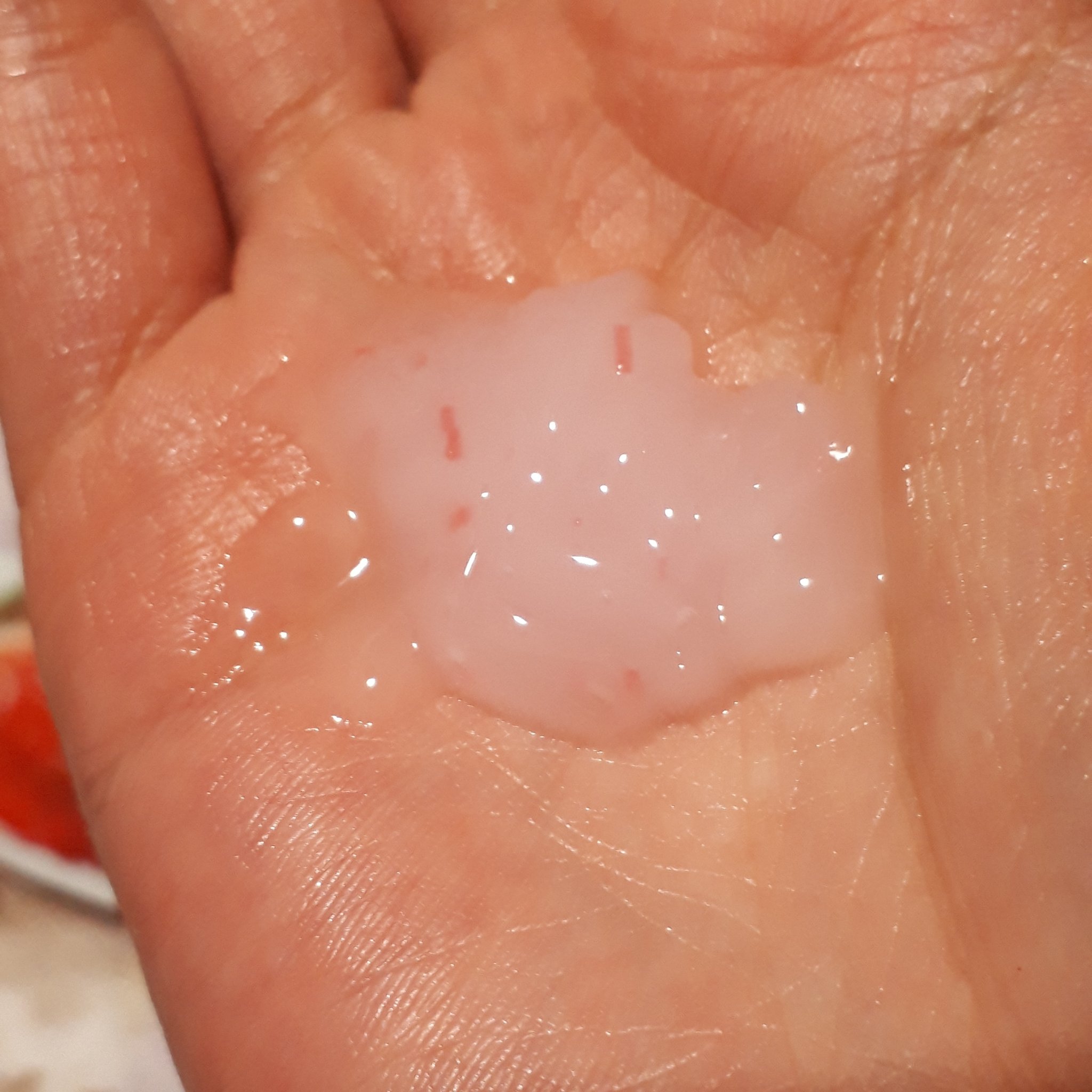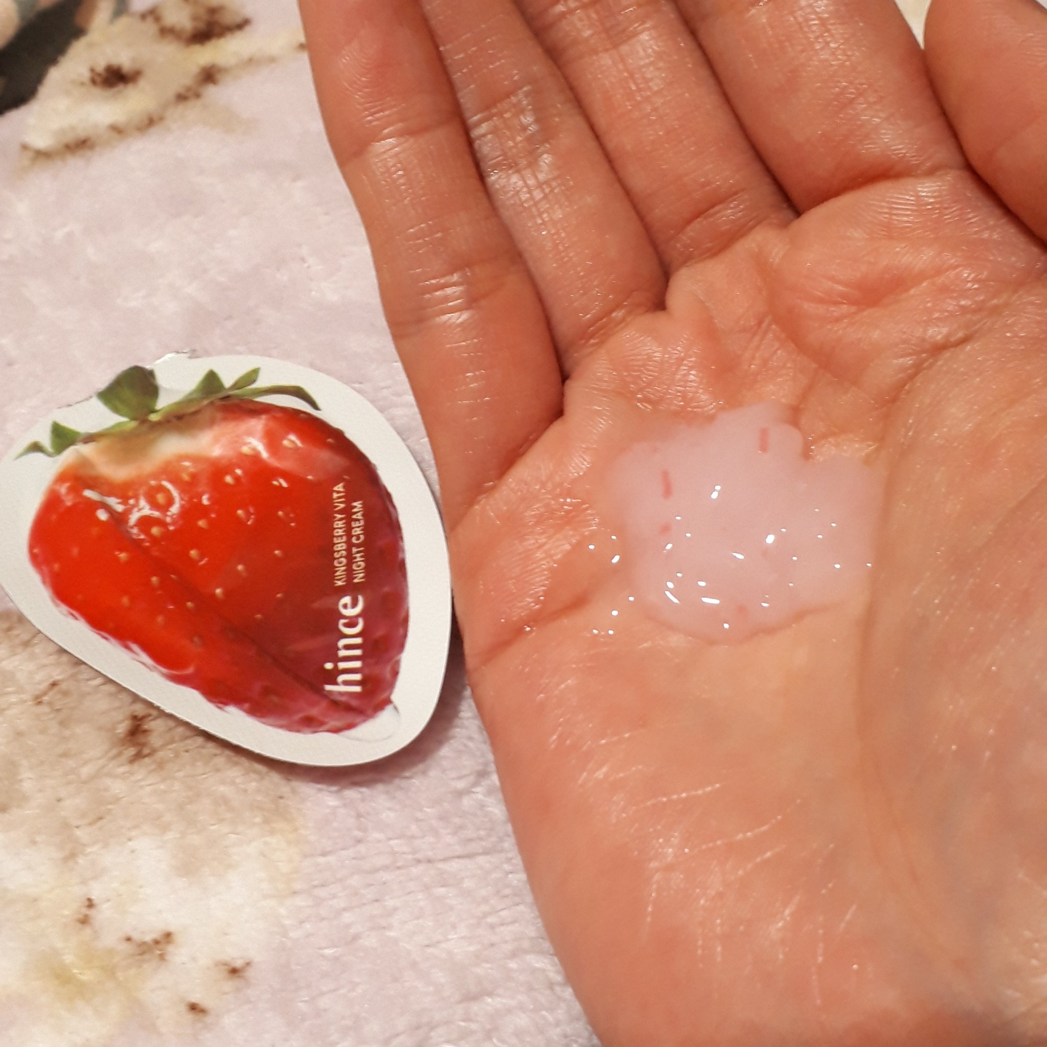 赤いビタビーズとキングスベリー水たっぷりのピューレテクスチャー🍓見た目もピンク色で可愛い🩷 伸びがよくすーっとお肌に浸透してくれます🥰 夜塗って寝ると翌朝のメイクノリがいつもよりよかったです💖