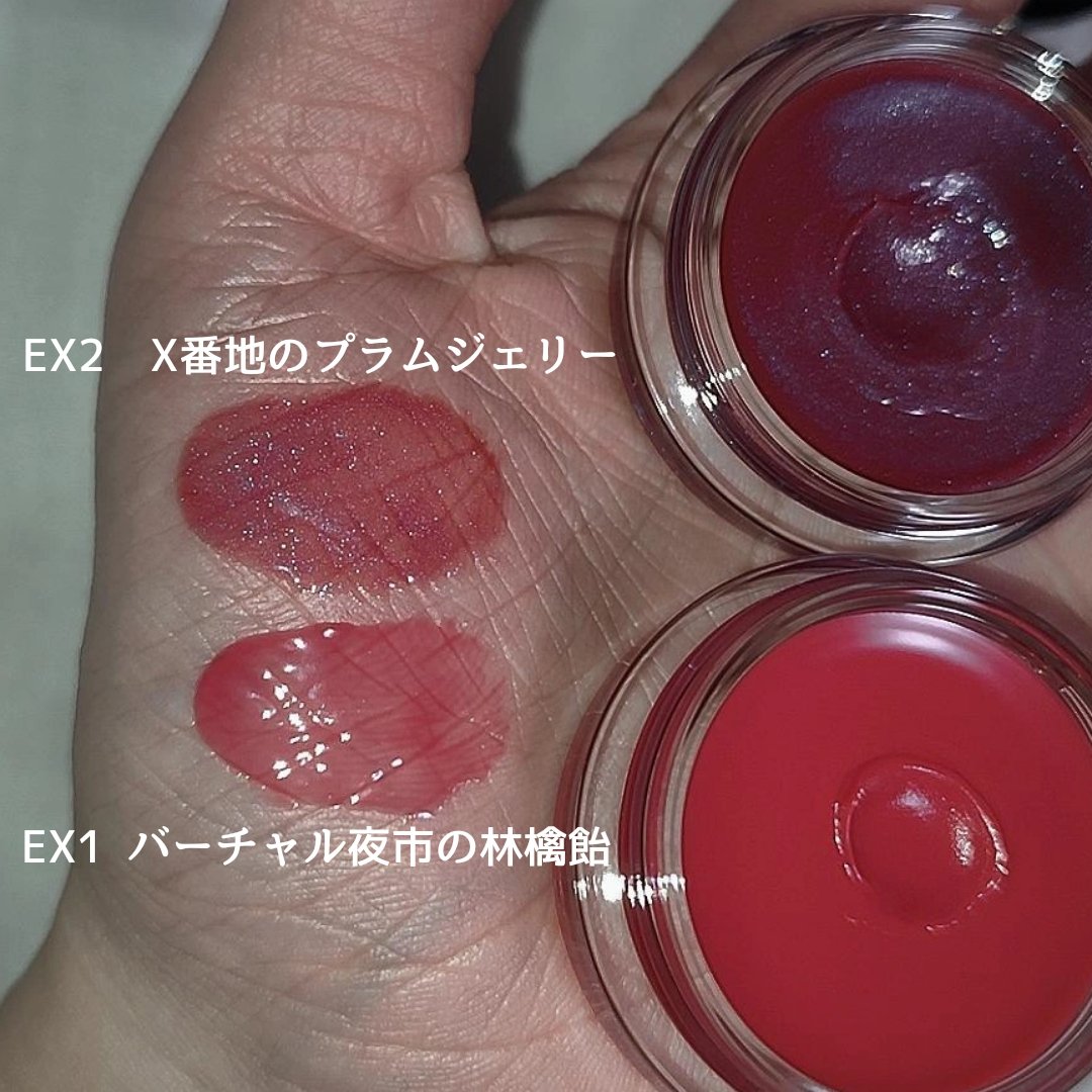 - <EX-1 バーチャル夜市の林檎飴(限定) 3.1g> 水添ポリイソブテン、イソノナン酸イソトリデシル、ダイマージリノール酸(フィトステリル/イソステアリル/セチル/ステアリル/ベヘニル)、トリ(カプリル酸/カプリン酸)グリセリル、合成ワックス、ラウロイルグルタミン酸ジ(オクチルドデシル/フィトステリル/ベヘニル)、マイクロクリスタリンワックス、ヒドロキシステアリン酸エチルヘキシル、ホホバ種子油、オリーブ果実油、アーモンド油、トコフェロール、ジメチコン、ヒアルロン酸Na、(+/-)グンジョウ、シリカ、マイカ、ラウロイルリシン、酸化チタン、水酸化Al、硫酸Ba、酸化スズ、ホウケイ酸(Ca/Al)、黄5、赤201、赤202 <EX-2 ネオシティの苺タルト(限定) 3.1g> 水添ポリイソブテン、イソノナン酸イソトリデシル、ダイマージリノール酸(フィトステリル/イソステアリル/セチル/ステアリル/ベヘニル)、トリ(カプリル酸/カプリン酸)グリセリル、合成ワックス、ラウロイルグルタミン酸ジ(オクチルドデシル/フィトステリル/ベヘニル)、マイクロクリスタリンワックス、ヒドロキシステアリン酸エチルヘキシル、ホホバ種子油、オリーブ果実油、アーモンド油、トコフェロール、ジメチコン、ヒアルロン酸Na、(+/-)グンジョウ、シリカ、マイカ、ラウロイルリシン、酸化チタン、水酸化Al、硫酸Ba、酸化スズ、ホウケイ酸(Ca/Al)、黄5、赤201、赤202 <EX-3 X番地のプラムジェリー(限定) 3.1g> 水添ポリイソブテン、イソノナン酸イソトリデシル、ダイマージリノール酸(フィトステリル/イソステアリル/セチル/ステアリル/ベヘニル)、トリ(カプリル酸/カプリン酸)グリセリル、合成ワックス、ラウロイルグルタミン酸ジ(オクチルドデシル/フィトステリル/ベヘニル)、マイクロクリスタリンワックス、ヒドロキシステアリン酸エチルヘキシル、ホホバ種子油、オリーブ果実油、アーモンド油、トコフェロール、ジメチコン、ヒアルロン酸Na、(+/-)グンジョウ、シリカ、マイカ、ラウロイルリシン、酸化チタン、水酸化Al、硫酸Ba、酸化スズ、ホウケイ酸(Ca/Al)、黄5、赤201、赤202