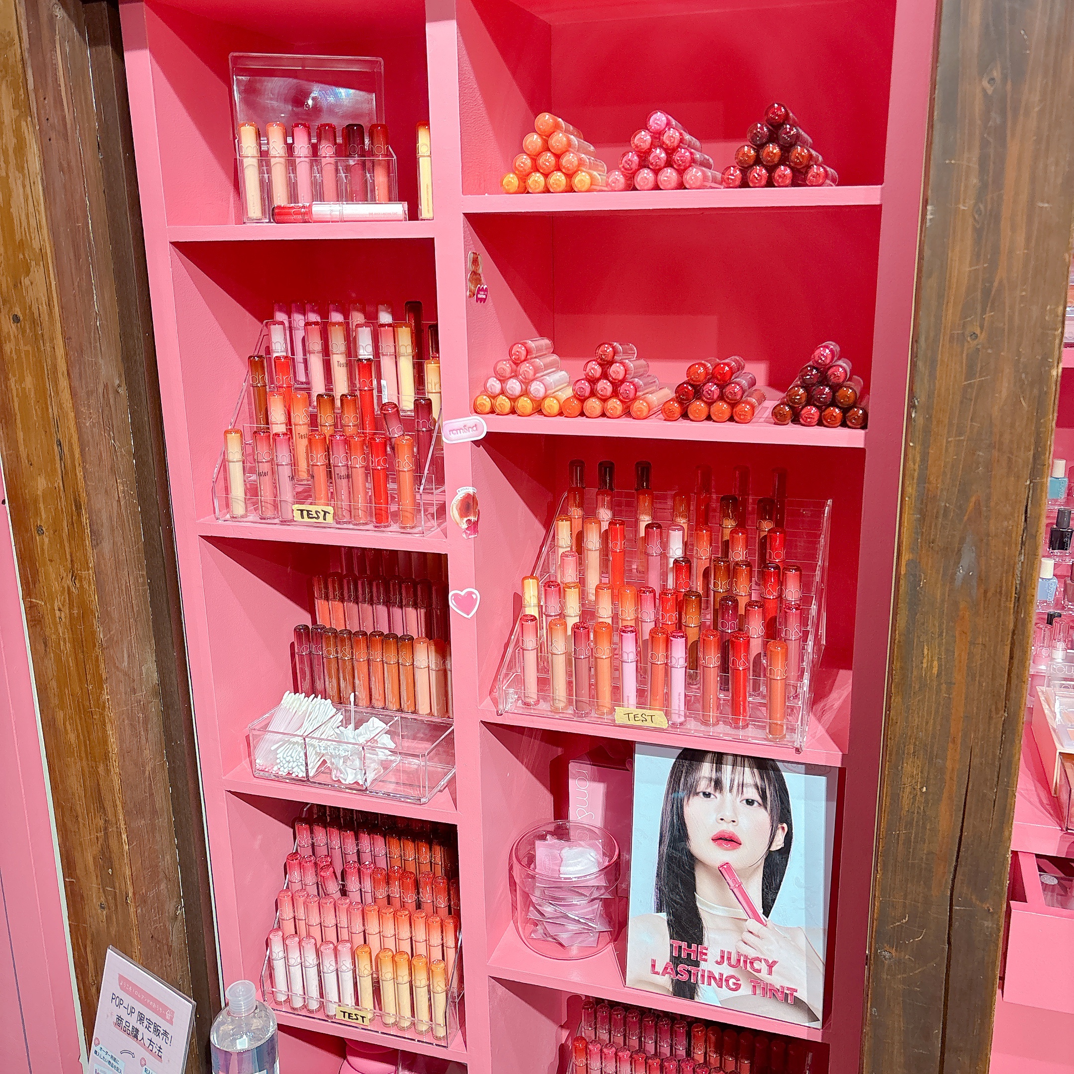コスメオタク以外立ち入り禁止のロムアンドのコタク(コスメオタク)による、特別な空間のピンクのおうち🩷 リニューアルされた"ザ ジューシーラスティングティント"を試したり、50色のスライドイン シングルを試したり、ロムアンドのおうちのゲストブックに訪問した記録を残したり… 日本未発売のカラーがあったり、見ているだけでも楽しいのですが、なんと購入も可能◎