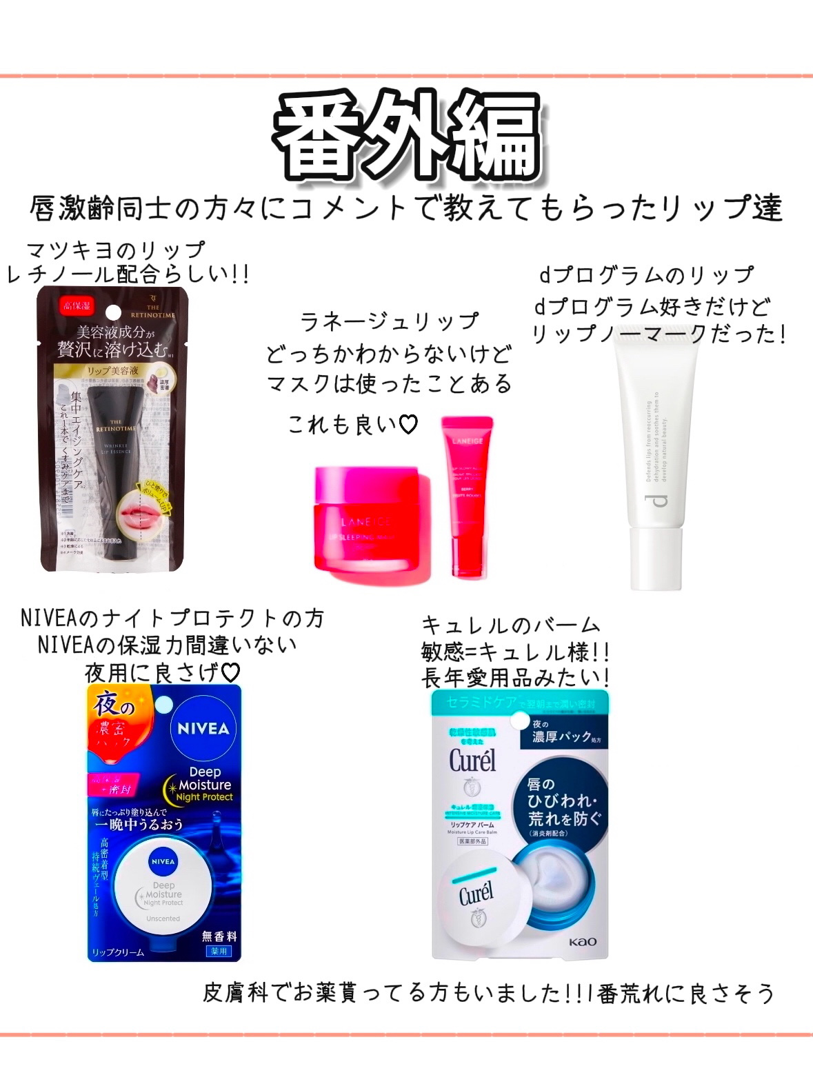 | 口紅・グロス・リップライナーランキング第99位 | 塗って寝て起きると唇がモチモチ、潤い感がめちゃくちゃ続く!塗った後に口紅を塗っても定着してくれる♪ | 詳細を見る | |