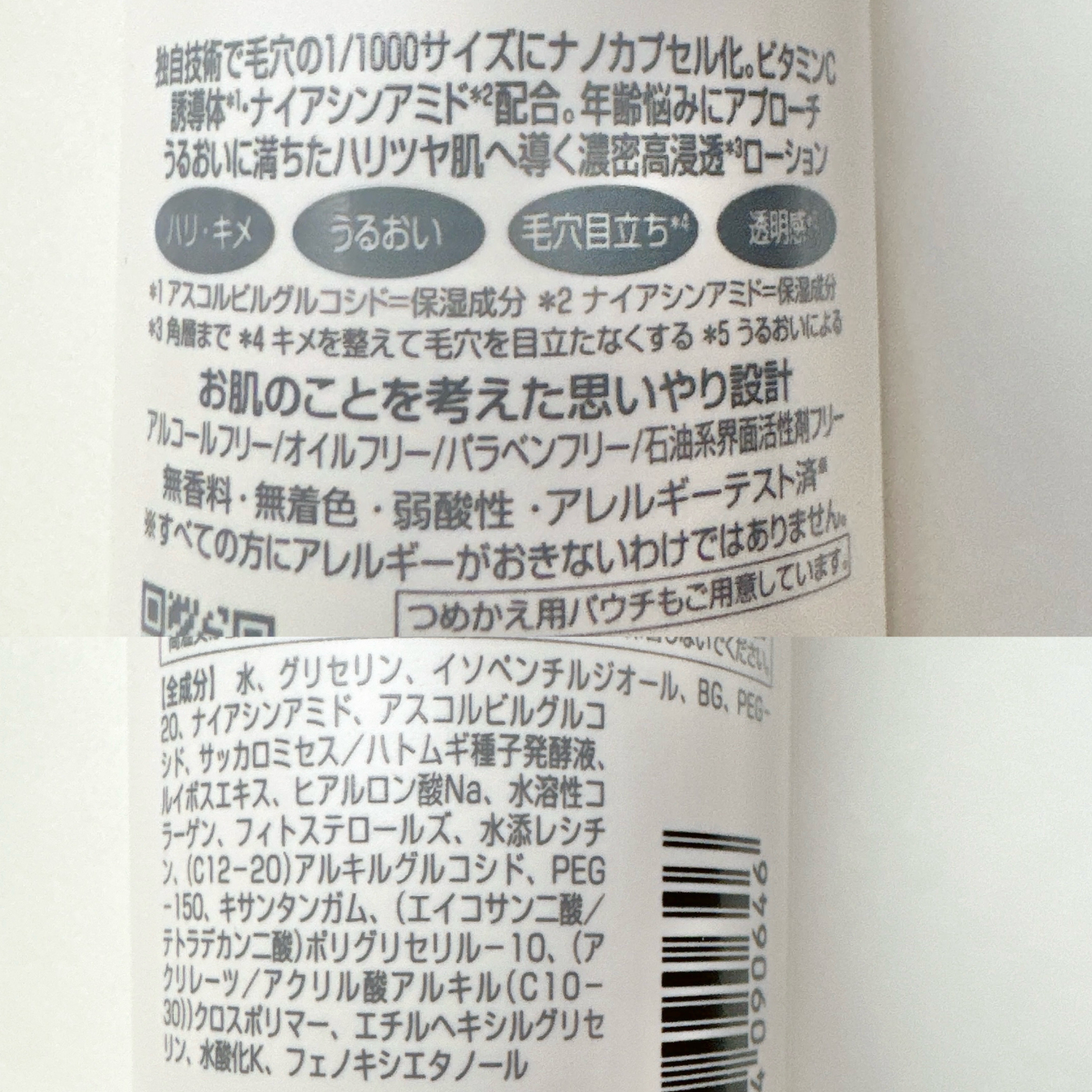- <本体150ml> 水、グリセリン、イソペンチルジオール、BG、PEG-20、ナイアシンアミド、アスコルビルグルコシド、サッカロミセス/ハトムギ種子発酵液、ルイボスエキス、ヒアルロン酸Na、水溶性コラーゲン、フィトステロールズ、水添レシチン、(C12-20)アルキルグルコシド、PEG-150、キサンタンガム、(エイコサン二酸/テトラデカン二酸)ポリグリセリル-10、(アクリレーツ/アクリル酸アルキル(C10-30))クロスポリマー、エチルヘキシルグリセリン、水酸化K、フェノキシエタノール <つめかえ用150ml> 水、グリセリン、イソペンチルジオール、BG、PEG-20、ナイアシンアミド、アスコルビルグルコシド、サッカロミセス/ハトムギ種子発酵液、ルイボスエキス、ヒアルロン酸Na、水溶性コラーゲン、フィトステロールズ、水添レシチン、(C12-20)アルキルグルコシド、PEG-150、キサンタンガム、(エイコサン二酸/テトラデカン二酸)ポリグリセリル-10、(アクリレーツ/アクリル酸アルキル(C10-30))クロスポリマー、エチルヘキシルグリセリン、水酸化K、フェノキシエタノール