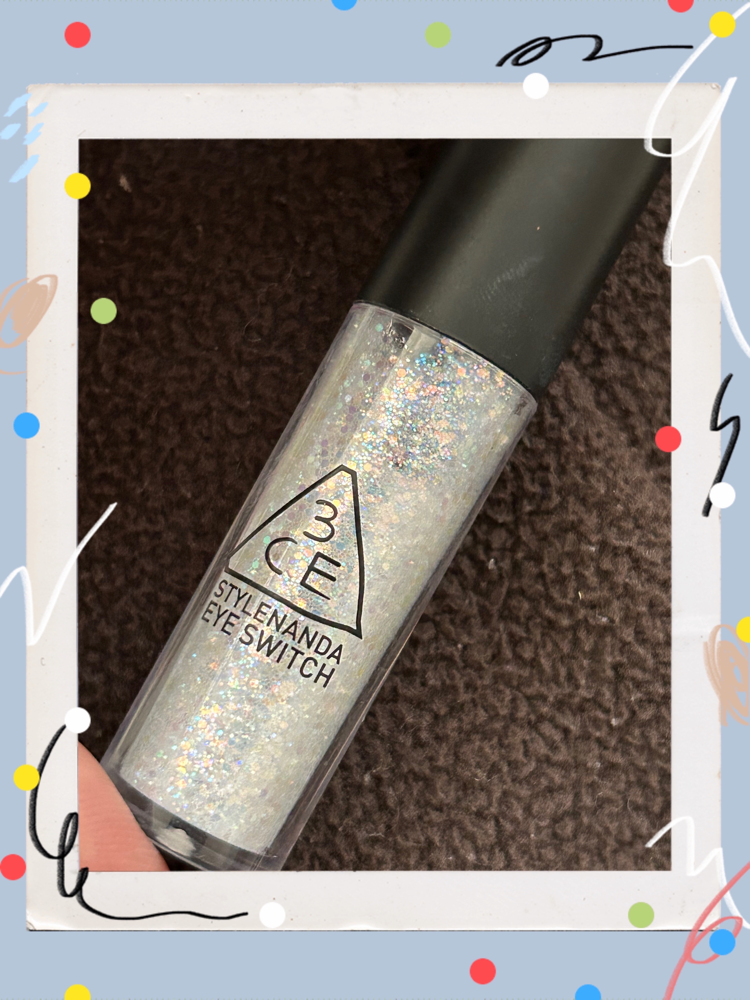 - きらめく多色ラメ。まるで星空 目元に存在感、簡単オン ■輝きも色味も自在なグリッター 大小さまざま、色味も豊かな多色ラメが目元にきらめきを。 薄づきだからやりすぎないのに、しっかり存在感。 ■塗りやすい極細チップ やわらかいゴム製アプリケーターで 細かい部分にも塗りやすいから、繊細な輝きを簡単オン ■ケア成分*1配合。明るい*2目元印象に ビタミンE*3とシアバター*4配合で目元にうるおいをプラスしかも、お湯で簡単オフ *1 グリセリン:保湿・保水成分 *2 メイクアップ効果による *3 酢酸トコフェロール:整肌成分 *4 シアバター(シア脂):油性基剤 ※注釈3・4は3CE アイスイッチに配合。