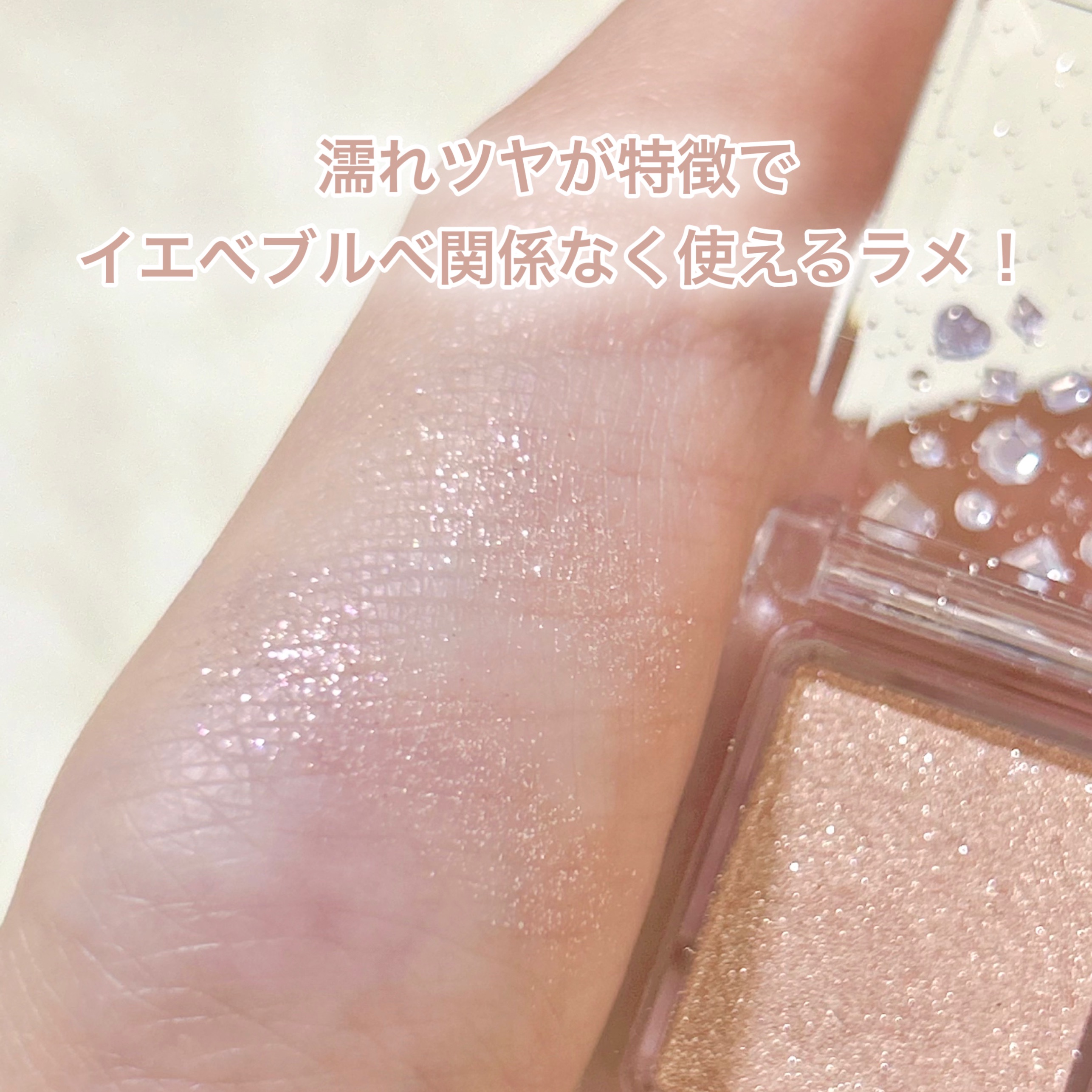 キャンメイク史上最もキラキラらしい2色入りの大粒のラメシャドウ💫 ベースの色は控えめで透け感のある濡れツヤシャドウがコンパクトなサイズに。 肌馴染みの良いベージュと黄み寄りなピンクの2色入りでした。使いやすいベーシックな色味かな? ラメマニアの方が若干だけどラメ飛びしにくいかな…と感じました🤔