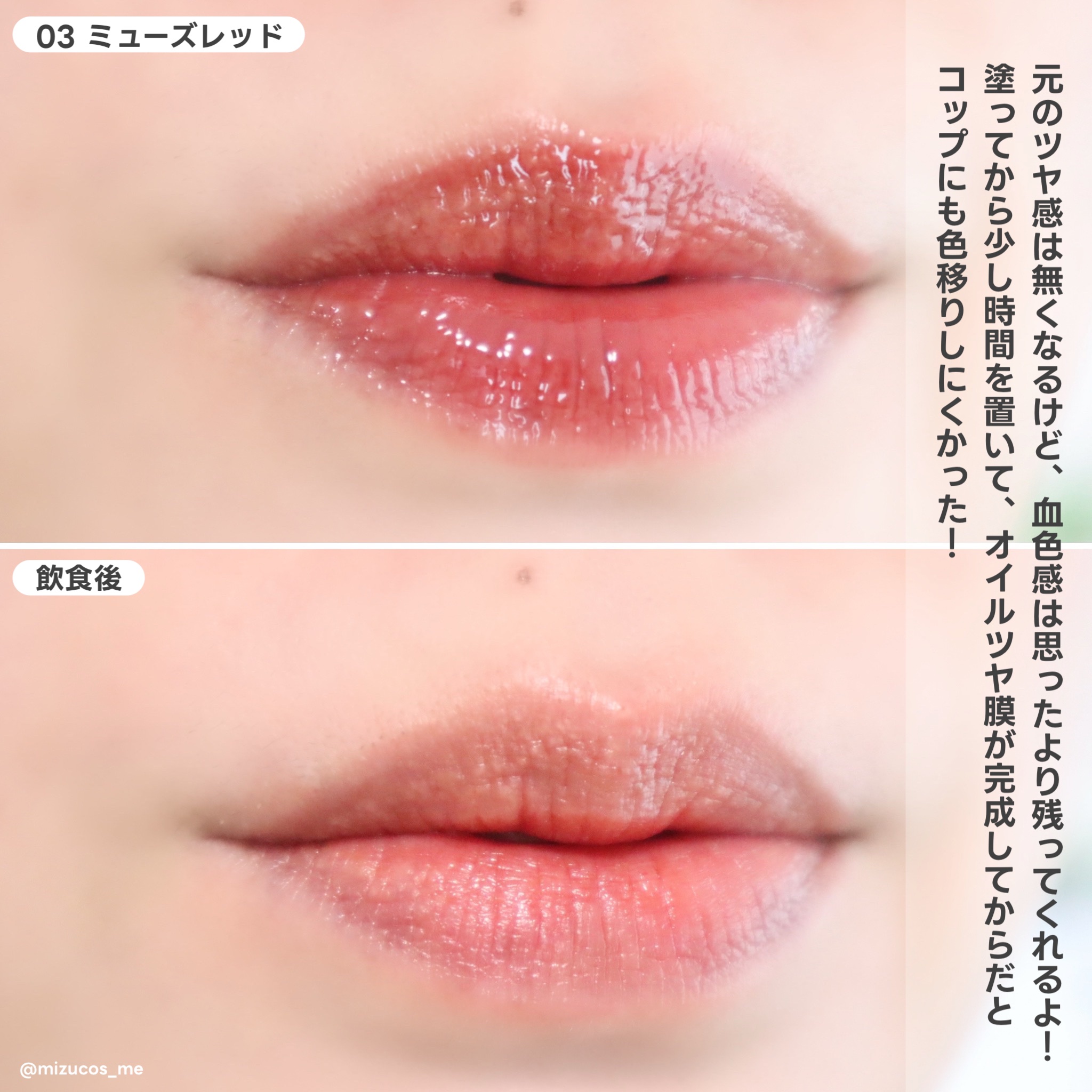 リップフィラー級のぷっくり感とちゅるんとしたみずみずしいツヤ感✨ 塗った直後より少し経った時の方がツヤオイル膜が浮き上がってじゅわっとツヤツヤにぷっくり唇に💋✨ ニュートラルカラーだからイエベ・ブルベ問わずに使えそうだよ👍