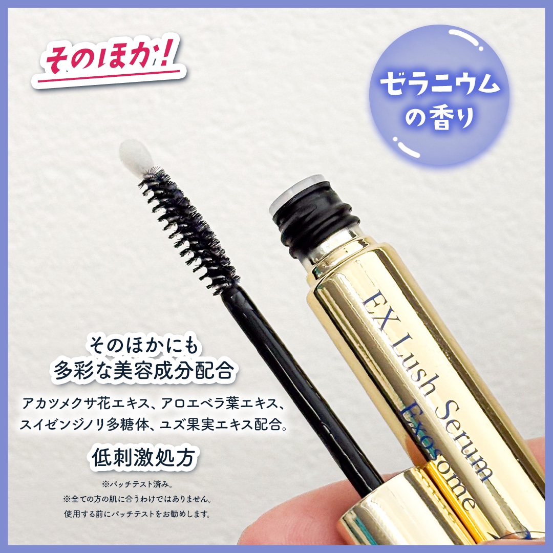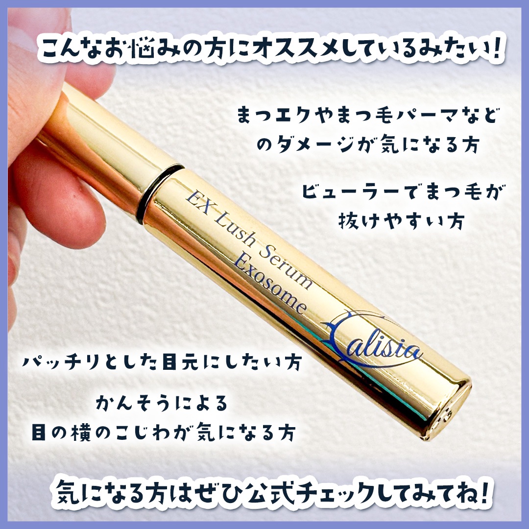 Alisia EX Lush serumは、生ビタミンを配合のハイブリッドエクソソームを使用したまつ毛をはじめ、目元周りの小ジワにも効果的な美容液です♡ この独自のエクソソームを3種類配合することで、まるで魔法をかけたかのような劇的な変化が期待できます♡ 特殊ヘッドブラシで、目の際や目元全体、まつげへと塗りやすい設計になってます♡