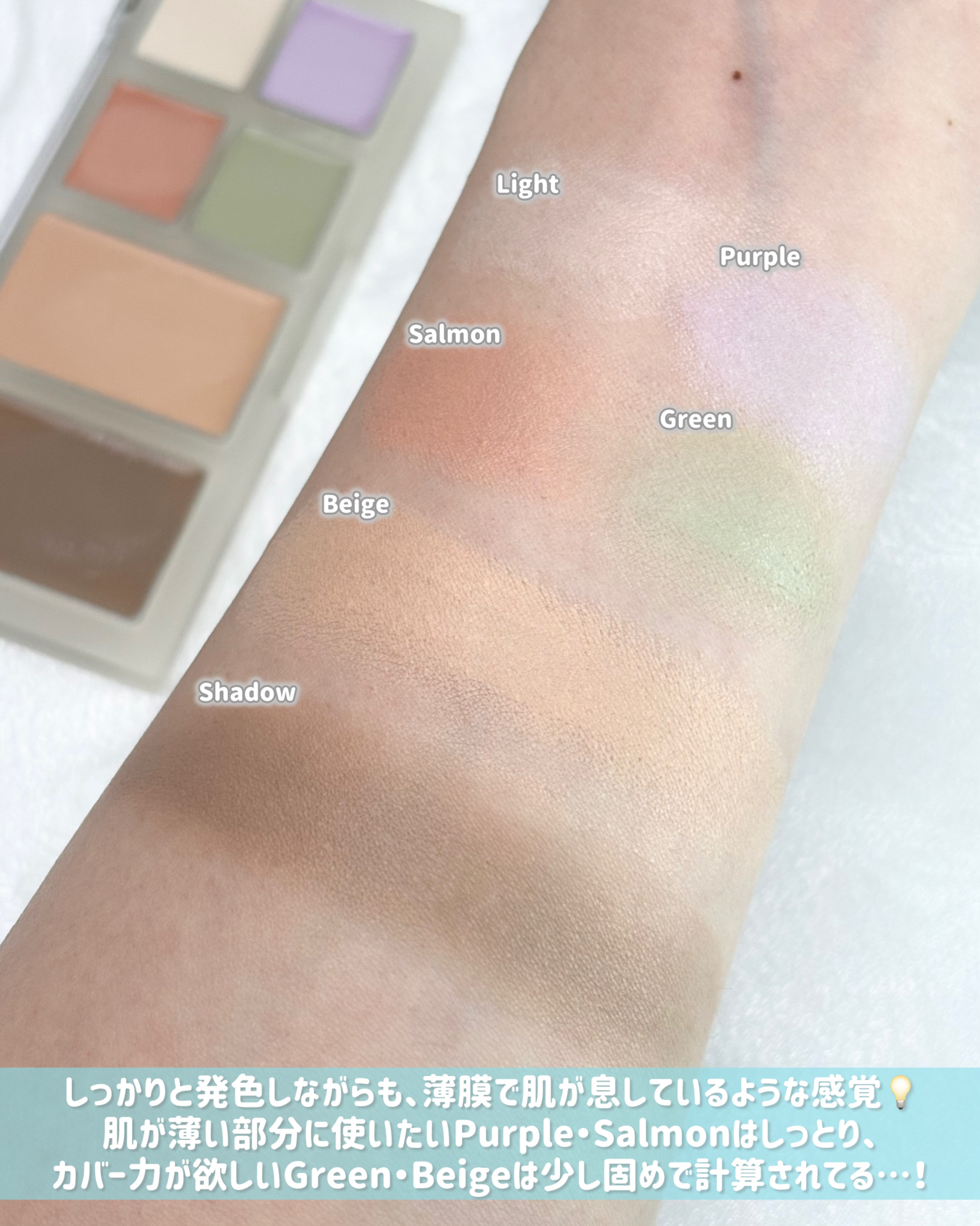 - 6色のカラーが入った、コンシーラーパレットで、コンシーラーとしてだけでなく、シェーディング、ハイライト、トーン調整が可能です。 ピーチ: クマカバーにおすすめ。保湿力が高く、ナチュラルなツヤ感です。 グリーン:ニキビや赤みのカバーにおすすめ。滑らかなテクスチャーで、カバー力が高いです。 パープル: くすみカバーにおすすめ。保湿力が高く、ナチュラルなツヤ感です。 ハイライト: 光の屈折を利用し、自然で柔らかい輝きを与えます。 シェーディング: 自然に影を演出し、しっかりと密着します。 コンシーラー: 滑らかなテクスチャーで、カバー力が高いです。