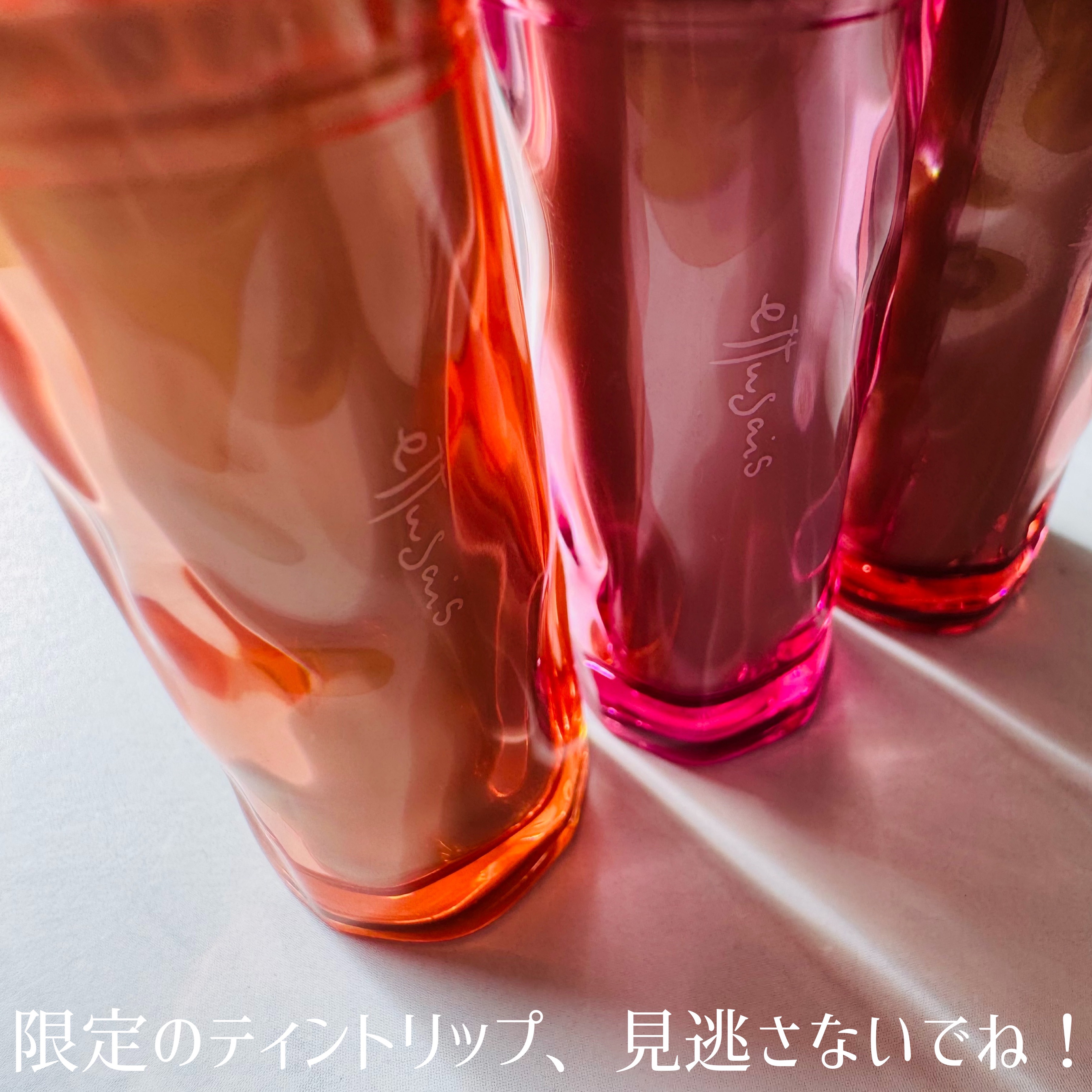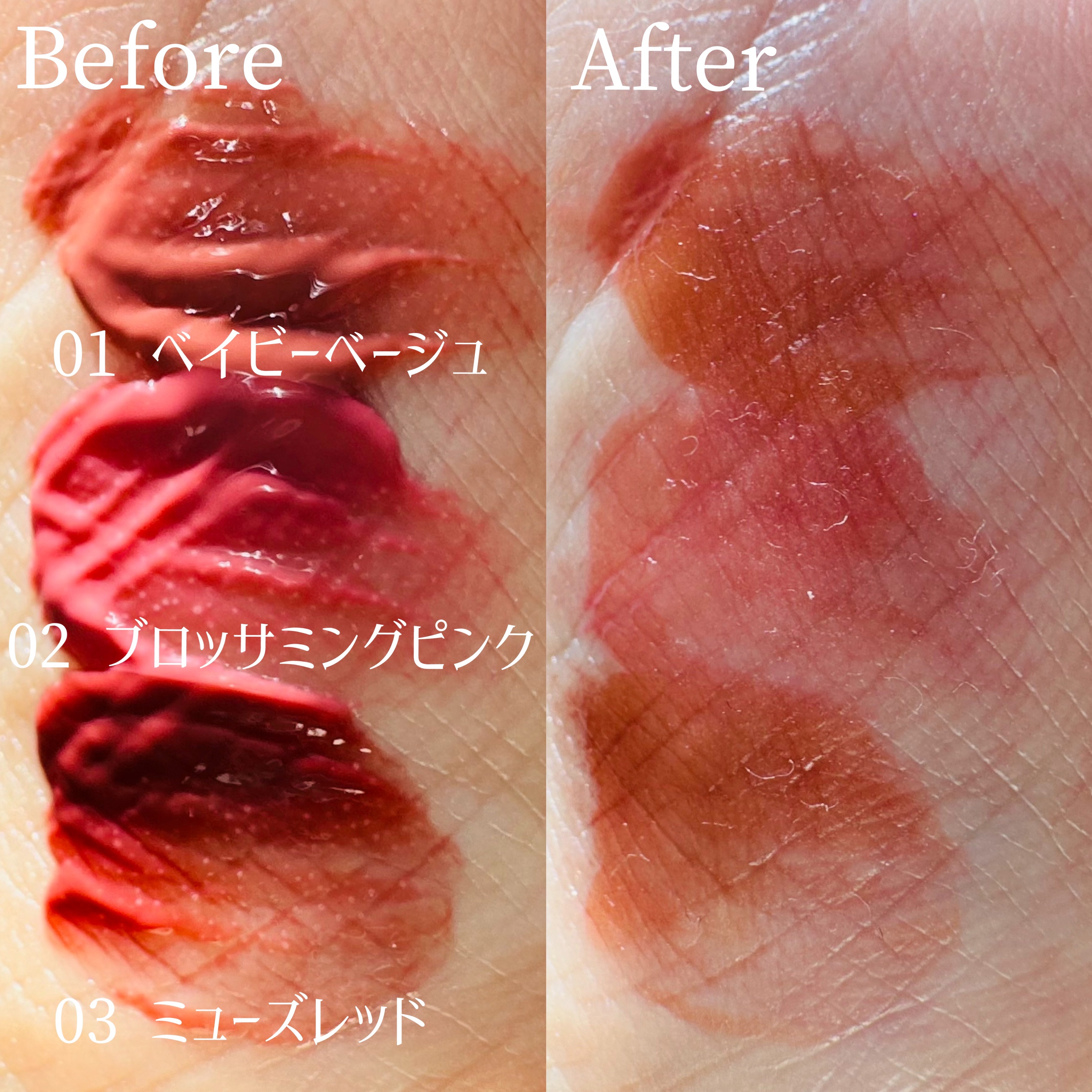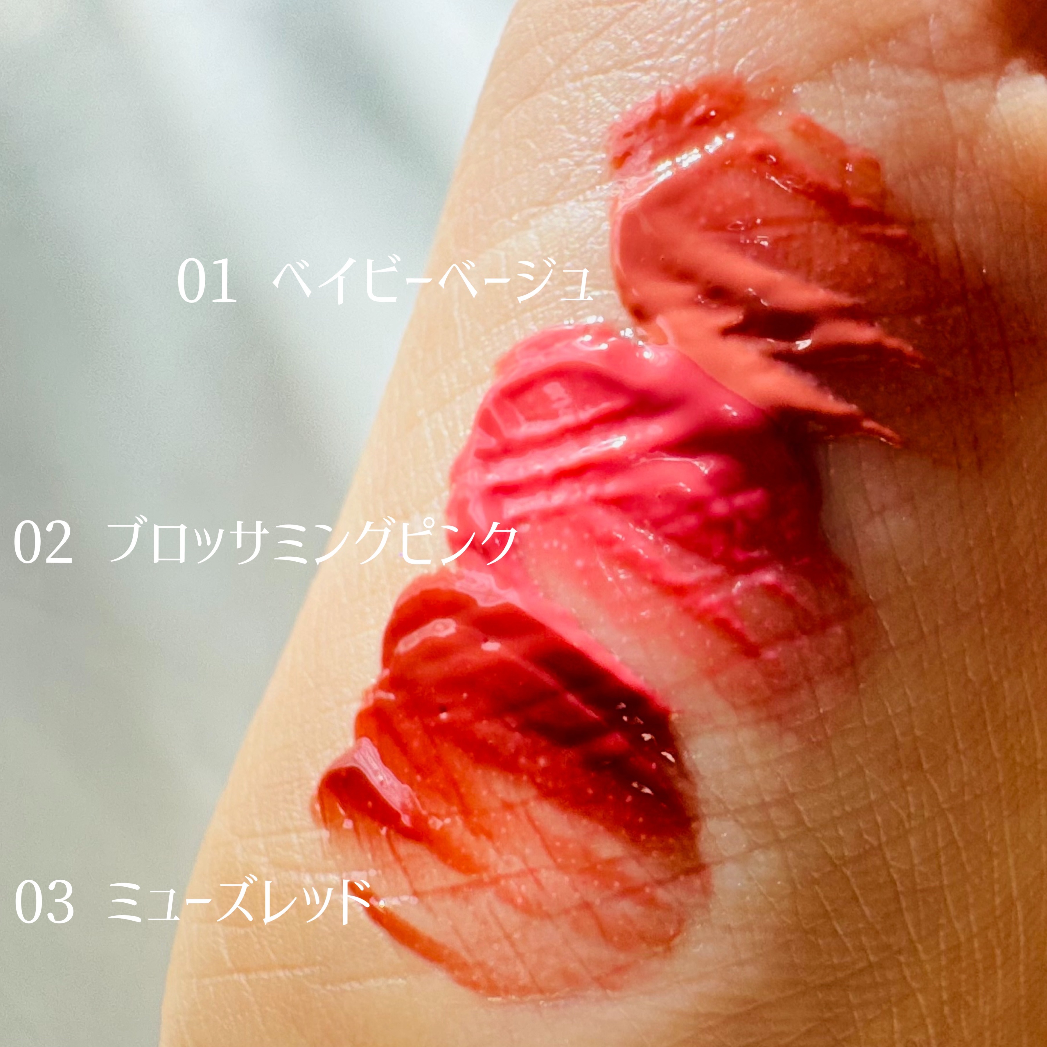 - <ベイビーベージュ> 水、リンゴ酸ジイソステアリル、ビスジグリセリルポリアシルアジペート-2、ジフェニルジメチコン、水添ポリイソブテン、トリメチルシロキシフェニルジメチコン、ポリフェニルシルセスキオキサン、グリセリン、セチルPEG/PPG-10/1ジメチコン、ポリソルベート60、イソステアリン酸ソルビタン、セテアレス-20、1,2-ヘキサンジオール、(アクリル酸ヒドロキシエチル/アクリロイルジメチルタウリンNa)コポリマー、酸化チタン、スクワラン、フェノキシエタノール、メントキシプロパンジオール、エチルヘキシルグリセリン、黄5、赤227、黄4、水酸化Al、ポリアクリル酸アンモニウム、BG、青1、テトラ(ジ-t-ブチルヒドロキシヒドロケイヒ酸)ペンタエリスリチル <ブロッサミングピンク> 水、リンゴ酸ジイソステアリル、ビスジグリセリルポリアシルアジペート-2、ジフェニルジメチコン、水添ポリイソブテン、トリメチルシロキシフェニルジメチコン、ポリフェニルシルセスキオキサン、グリセリン、セチルPEG/PPG-10/1ジメチコン、ポリソルベート60、イソステアリン酸ソルビタン、セテアレス-20、1,2-ヘキサンジオール、(アクリル酸ヒドロキシエチル/アクリロイルジメチルタウリンNa)コポリマー、スクワラン、フェノキシエタノール、メントキシプロパンジオール、酸化チタン、エチルヘキシルグリセリン、黄5、赤227、水酸化Al、黄4、ポリアクリル酸アンモニウム、青1、BG、テトラ(ジ-t-ブチルヒドロキシヒドロケイヒ酸)ペンタエリスリチル <ミューズレッド> 水、リンゴ酸ジイソステアリル、ビスジグリセリルポリアシルアジペート-2、ジフェニルジメチコン、水添ポリイソブテン、トリメチルシロキシフェニルジメチコン、ポリフェニルシルセスキオキサン、グリセリン、セチルPEG/PPG-10/1ジメチコン、ポリソルベート60、イソステアリン酸ソルビタン、セテアレス-20、1,2-ヘキサンジオール、(アクリル酸ヒドロキシエチル/アクリロイルジメチルタウリンNa)コポリマー、スクワラン、フェノキシエタノール、メントキシプロパンジオール、酸化鉄、酸化チタン、エチルヘキシルグリセリン、赤227、黄4、黄5、ポリアクリル酸アンモニウム、水酸化Al、青1、BG、テトラ(ジ-t-ブチルヒドロキシヒドロケイヒ酸)ペンタエリスリチル