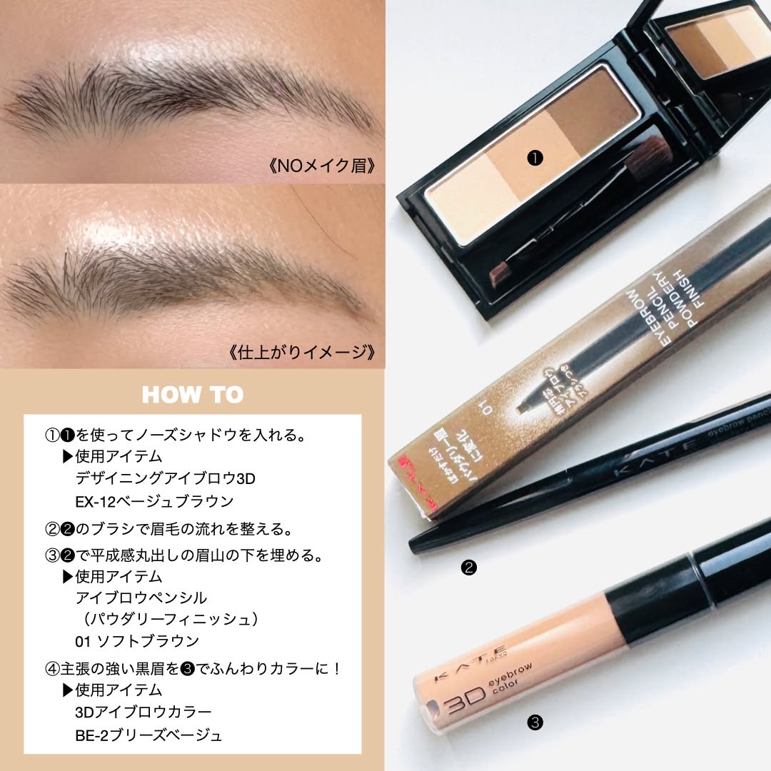 描きやすくて硬さが丁度いい🥹 パウダリーな仕上がりでぼかすとふんわり眉に🪞 3DアイブロウカラーZをプラスすると よりふんわり脱色したような色合いに🤤🤎 低彩度グレージュニュアンスが自眉の黒を押さえながら ミュートカラーにグレーが潜んでトレンド感あってオシャレ🗝️