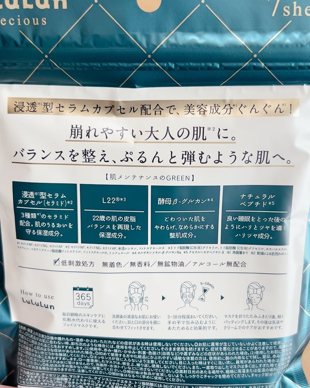 - <ルルルンプレシャス GREEN(バランス)32枚入【旧】> 水、グリセリン、BG、マルチトール、クインスシードエキス、トリ脂肪酸(C18-36)グリセリル、トリ脂肪酸(C12-18)グリセリル、ホホバエステル、スクワレン、マカデミアナッツ脂肪酸フィトステリル、フィトステロールズ、トコフェロール、フィトール、イソマルト、セラミドNP、セラミドNG、セラミドAP、カルボキシメチル-β-グルカンNa、アセチルヘキサペプチド-8、乳酸桿菌発酵液、水添レシチン、マルトデキストリン、カプリリルグリコール、イソステアリン酸ポリグリセリル-10、キサンタンガム、クエン酸、クエン酸Na、フェノキシエタノール、メチルパラベン <ルルルンプレシャス GREEN(バランス)7枚入【旧】> 水、グリセリン、BG、マルチトール、クインスシードエキス、トリ脂肪酸(C18-36)グリセリル、トリ脂肪酸(C12-18)グリセリル、ホホバエステル、スクワレン、マカデミアナッツ脂肪酸フィトステリル、フィトステロールズ、トコフェロール、フィトール、イソマルト、セラミドNP、セラミドNG、セラミドAP、カルボキシメチル-β-グルカンNa、アセチルヘキサペプチド-8、乳酸桿菌発酵液、水添レシチン、マルトデキストリン、カプリリルグリコール、イソステアリン酸ポリグリセリル-10、キサンタンガム、クエン酸、クエン酸Na、フェノキシエタノール、メチルパラベン