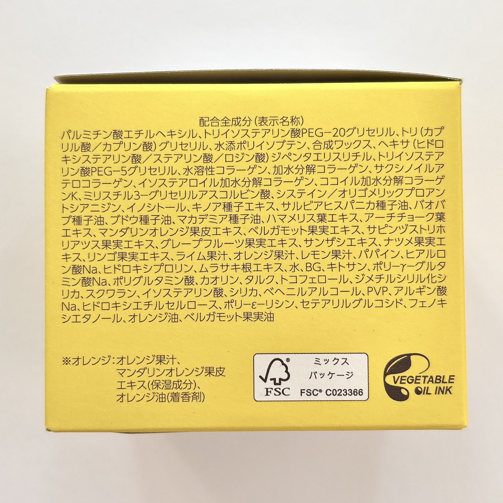 - <75g> パルミチン酸エチルヘキシル、トリイソステアリン酸PEG-20グリセリル、トリ(カプリル酸/カプリン酸)グリセリル、水添ポリイソブテン、合成ワックス、ヘキサ(ヒドロキシステアリン酸/ステアリン酸/ロジン酸)ジペンタエリスリチル、トリイソステアリン酸PEG-5グリセリル、水溶性コラーゲン、加水分解コラーゲン、サクシノイルアテロコラーゲン、イソステアロイル加水分解コラーゲン、ココイル加水分解コラーゲンK、ミリスチル3−グリセリルアスコルビン酸、システイン/オリゴメリックプロアントシアニジン、イノシトール、キノア種子エキス、サルビアヒスパニカ種子油、バオバブ種子油、ブドウ種子油、マカデミア種子油、ハマメリス葉エキス、アーチチョーク葉エキス、マンダリンオレンジ果皮エキス、ベルガモット果実エキス、サピンヅストリホリアツス果実エキス、グレープフルーツ果実エキス、サンザシエキス、ナツメ果実エキス、リンゴ果実エキス、ライム果汁、オレンジ果汁、レモン果汁、パパイン、ヒアルロン酸Na、ヒドロキシプロリン、ムラサキ根エキス、水、BG、キトサン、ポリ-γ-グルタミン酸Na、ポリグルタミン酸、カオリン、タルク、トコフェロール、ジメチルシリル化シリカ、スクワラン、イソステアリン酸、シリカ、ベヘニルアルコール、PVP、アルギン酸Na、ヒドロキシエチルセルロース、ポリ-ε-リシン、セテアリルグルコシド、フェノキシエタノール、オレンジ油、ベルガモット果実油 <ポムポムプリンデザイン(75g)> パルミチン酸エチルヘキシル、トリイソステアリン酸PEG-20グリセリル、トリ(カプリル酸/カプリン酸)グリセリル、水添ポリイソブテン、合成ワックス、ヘキサ(ヒドロキシステアリン酸/ステアリン酸/ロジン酸)ジペンタエリスリチル、トリイソステアリン酸PEG-5グリセリル、水溶性コラーゲン、加水分解コラーゲン、サクシノイルアテロコラーゲン、イソステアロイル加水分解コラーゲン、ココイル加水分解コラーゲンK、ミリスチル3−グリセリルアスコルビン酸、システイン/オリゴメリックプロアントシアニジン、イノシトール、キノア種子エキス、サルビアヒスパニカ種子油、バオバブ種子油、ブドウ種子油、マカデミア種子油、ハマメリス葉エキス、アーチチョーク葉エキス、マンダリンオレンジ果皮エキス、ベルガモット果実エキス、サピンヅストリホリアツス果実エキス、グレープフルーツ果実エキス、サンザシエキス、ナツメ果実エキス、リンゴ果実エキス、ライム果汁、オレンジ果汁、レモン果汁、パパイン、ヒアルロン酸Na、ヒドロキシプロリン、ムラサキ根エキス、水、BG、キトサン、ポリ-γ-グルタミン酸Na、ポリグルタミン酸、カオリン、タルク、トコフェロール、ジメチルシリル化シリカ、スクワラン、イソステアリン酸、シリカ、ベヘニルアルコール、PVP、アルギン酸Na、ヒドロキシエチルセルロース、ポリ-ε-リシン、セテアリルグルコシド、フェノキシエタノール、オレンジ油、ベルガモット果実油 <ちいかわ限定デザイン> シリカ、カオリン、水、ベヘニルアルコール、BG、ヒアルロン酸Na、フェノキシエタノール、タルク、スクワラン、トコフェロール、水溶性コラーゲン、ライム果汁、マンダリンオレンジ果皮エキス、サンザシエキス、マカデミア種子油、パルミチン酸エチルヘキシル、加水分解コラーゲン、ヒドロキシエチルセルロース、イソステアリン酸、ムラサキ根エキス、水添ポリイソブテン、ベルガモット果実油、サピンヅストリホリアツス果実エキス、セテアリルグルコシド、ヘキサ(ヒドロキシステアリン酸/ステアリン酸/ロジン酸)ジペンタエリスリチル、ポリグルタミン酸、アルギン酸Na、バオバブ種子油、オレンジ油、トリ(カプリル酸/カプリン酸)グリセリル、トリイソステアリン酸PEG-20グリセリル、トリイソステアリン酸PEG-5グリセリル、ハマメリス葉エキス、アーチチョーク葉エキス、PVP、サルビアヒスパニカ種子油、パパイン、レモン果汁、グレープフルーツ果実エキス、オレンジ果汁、ナツメ果実エキス、リンゴ果実エキス、ココイル加水分解コラーゲンK、ヒドロキシプロリン、イノシトール、合成ワックス、ジメチルシリル化シリカ、ポリ-ε-リシン、キトサン、システイン/オリゴメリックプロアントシアニジン、ポリ-γ-グルタミン酸Na、サクシノイルアテロコラーゲン、ブドウ種子油、ベルガモット果実エキス、キノア種子エキス、イソステアロイル加水分解コラーゲン、ミリスチル3−グリセリルアスコルビン酸 <ポムポムプリン 限定デザイン> パルミチン酸エチルヘキシル、トリイソステアリン酸PEG-20グリセリル、トリ(カプリル酸/カプリン酸)グリセリル、水添ポリイソブテン、合成ワックス、ヘキサ(ヒドロキシステアリン酸/ステアリン酸/ロジン酸)ジペンタエリスリチル、トリイソステアリン酸PEG-5グリセリル、水溶性コラーゲン、加水分解コラーゲン、サクシノイルアテロコラーゲン、イソステアロイル加水分解コラー