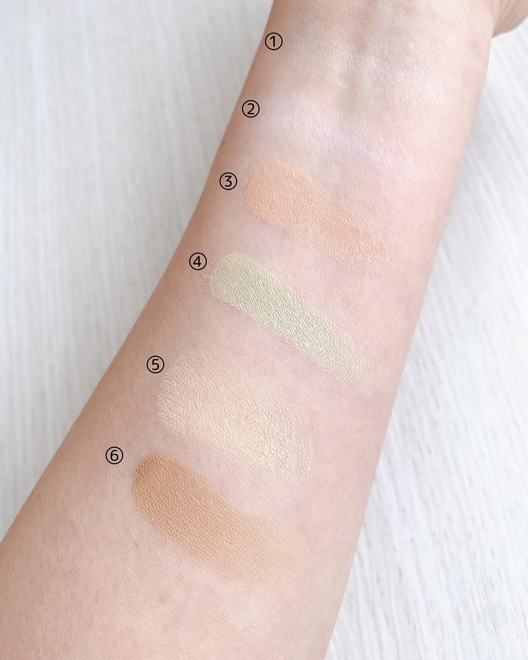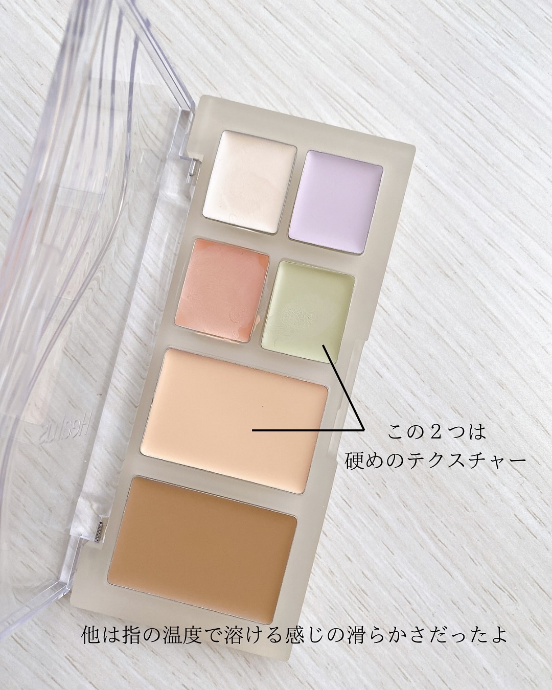 - 6色のカラーが入った、コンシーラーパレットで、コンシーラーとしてだけでなく、シェーディング、ハイライト、トーン調整が可能です。 ピーチ: クマカバーにおすすめ。保湿力が高く、ナチュラルなツヤ感です。 グリーン:ニキビや赤みのカバーにおすすめ。滑らかなテクスチャーで、カバー力が高いです。 パープル: くすみカバーにおすすめ。保湿力が高く、ナチュラルなツヤ感です。 ハイライト: 光の屈折を利用し、自然で柔らかい輝きを与えます。 シェーディング: 自然に影を演出し、しっかりと密着します。 コンシーラー: 滑らかなテクスチャーで、カバー力が高いです。