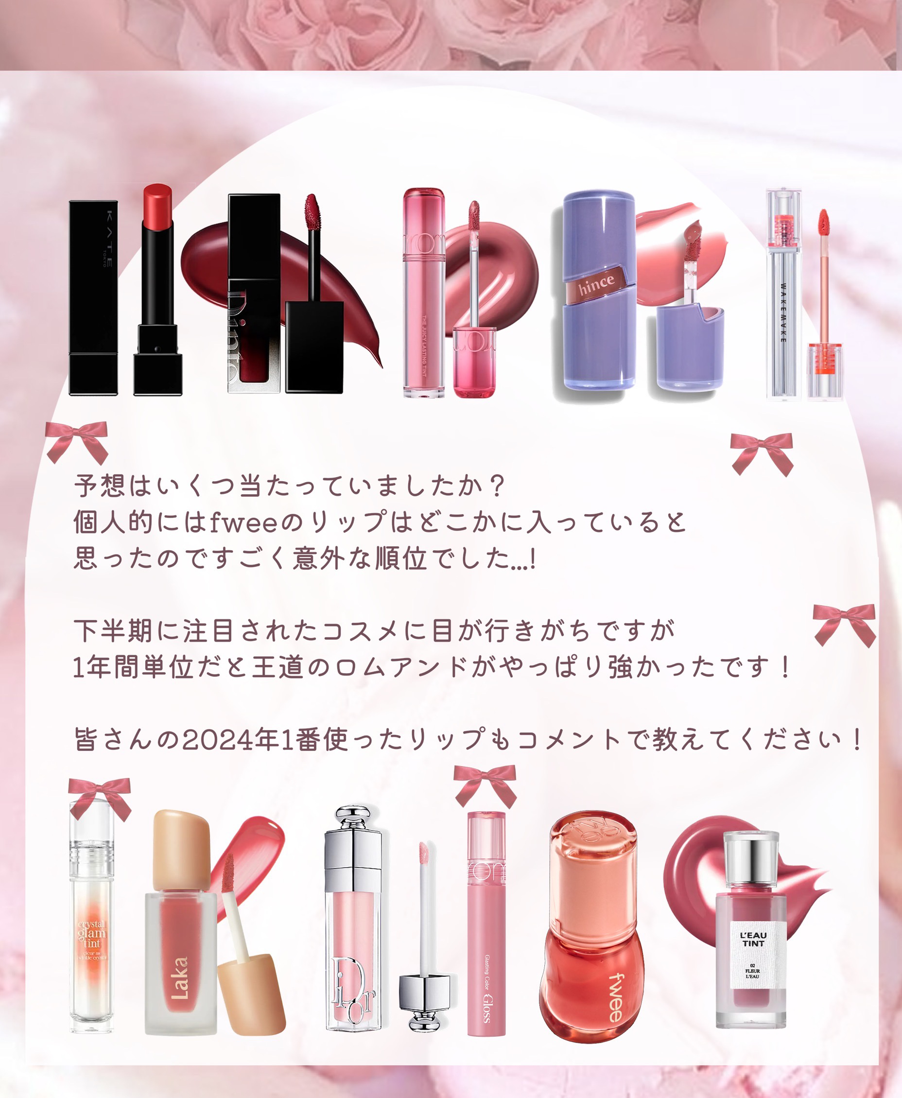 | 口紅・グロス・リップライナーランキング第83位 | うるツヤビー玉のようなツヤ感のティント♡ どれもじんわり血色感の粘膜カラーで使いやすいです!! これはヘビロテ! | 詳細を見る | |