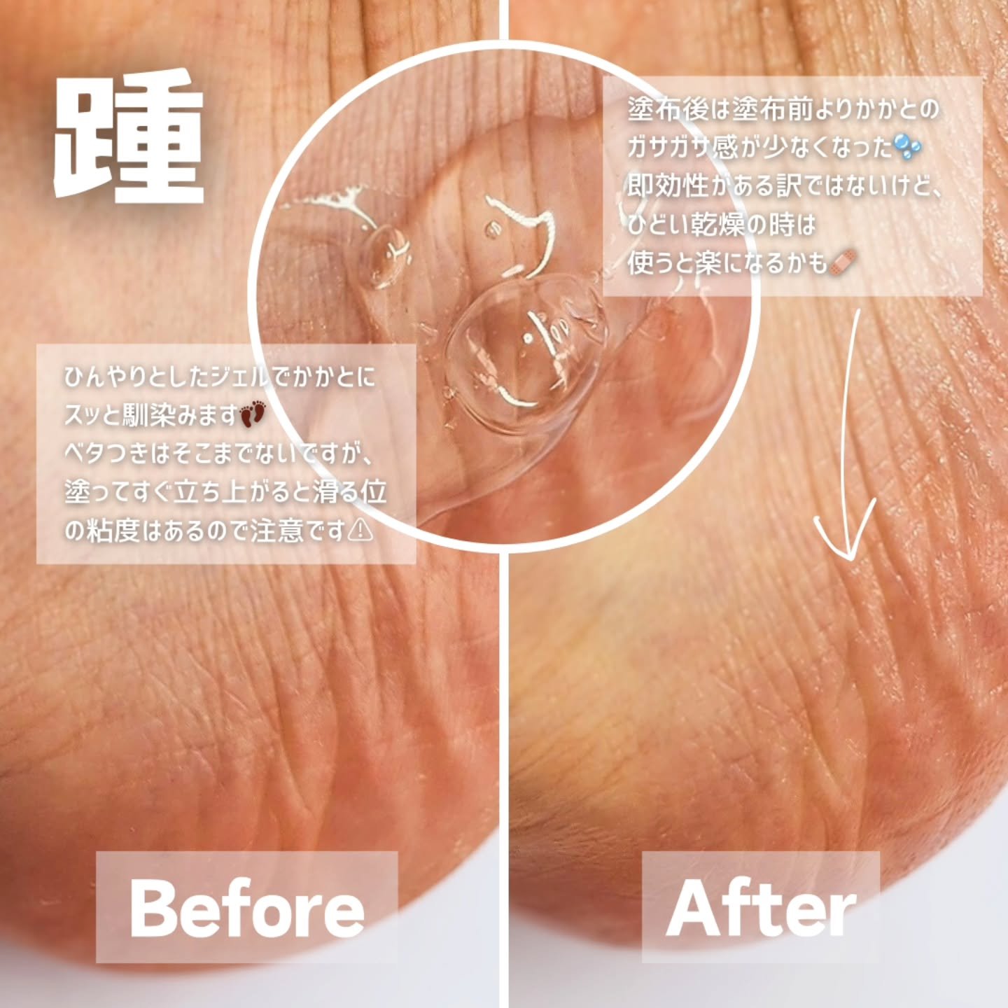 - かかとのひび割れを防ぐ薬用フットケアジェル。 ●Wの有効成分配合:尿素(水分保持有効成分)・グリチルリチン酸ジカリウム(抗炎症有効成分) ●分厚いかかとの角層を柔らかくし、ひび割れや乾燥を防いでなめらかなかかとに。 ●ベタつかずにすっと浸透する、オイルフリーのジェル状美容液。 ●3 種の植物由来の保湿成分、ヨクイニンエキス・リンゴ酸・チャエキス配合。 ●ラベンダーの香り。