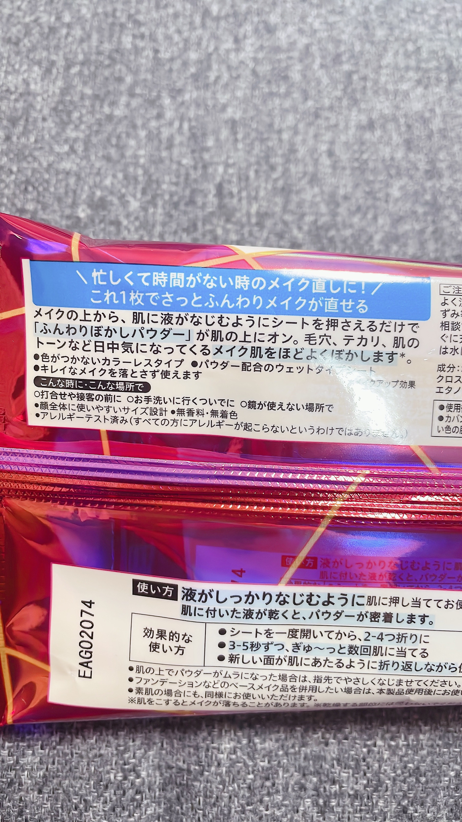 1枚でさっとふんわりメイク直し。メイクの上から押さえるだけで「ふんわりぼかしパウダー」が肌の上にオン。毛穴、テカリ、肌のトーンなど日中気になってくるメイク肌をほどよくぼかします。 無香料・無着色です。Tゾーンのテカリ・ファンデの毛穴落ち防ぐ「さらマット肌持続シート」。テカリが気になった時に、メイクの上からじんわり押しあて、「皮脂吸収ヴェール」をオン。 使用後のほうがキレイに見えます。しばらくするとサラッサラになるので、メイク直しもとっても快適。