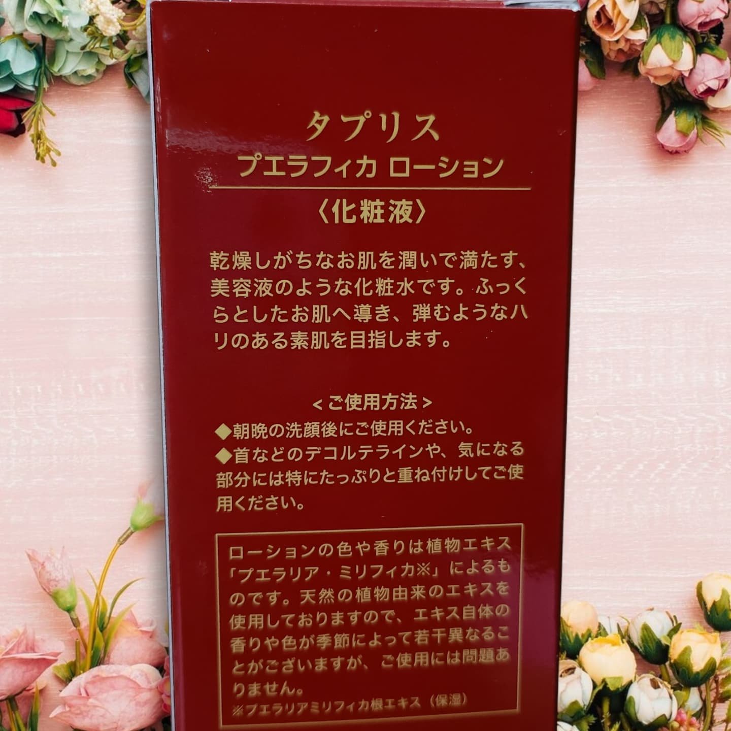 タプリスは女性特有の身体のリズムやライフスタイルの変化、環境汚染のストレスなどあらゆる肌悩みのモヤモヤに寄り添いながらお肌を整えて底上げしてくれるスキンケアブランド。 プエラフィカローションは、プエラリアミリフィカエキスが高配合された化粧水。 琥珀色で甘い香りがするので贅沢な気分を味わいながらスキンケアできます。 これまでずっと乾燥に悩んできたけど、使い始めてから翌朝までお肌が潤っているのを実感🫧 高級感のあるパッケージも気分が上がります🌹