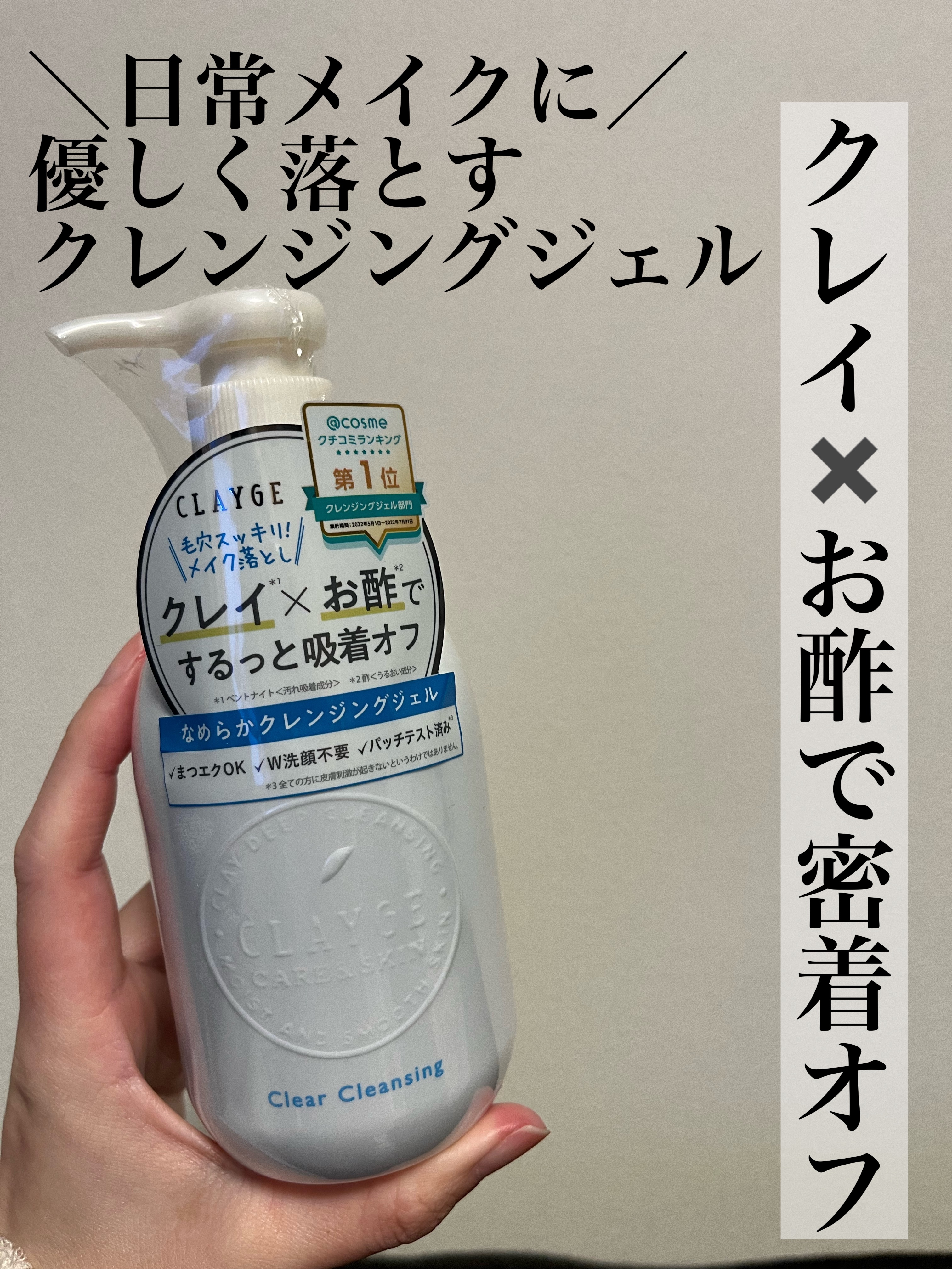 - ミネラル豊富な「天然クレイ」とスキンケア成分「お酢」を配合した、透明肌に導くクレンジングジェル。 しっかりメイクや毛穴の汚れにすばやくなじみ、粒子の大きさや機能性が異なる2種のクレイで、毛穴の奥の汚れをしっかりと吸着除去。 また、お酢成分が肌表面のくすみや古い角質をキレイに洗い上げ、キメを整えます。 3種のヒト型セラミドやビタミンC誘導体、プラセンタエキスなど機能性の保湿成分もたっぷり配合し、潤いを保ちながら毛穴と肌を引き締めてなめらかな洗い上がりに。 マツエクでもOKで、濡れた手肌でも使えます。 ダブル洗顔不要なので時短にも。 リラックスハーブの香り。
