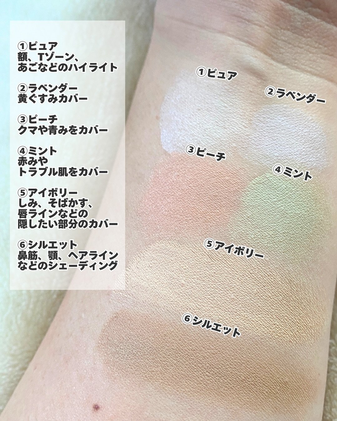 - 6色のカラーが入った、コンシーラーパレットで、コンシーラーとしてだけでなく、シェーディング、ハイライト、トーン調整が可能です。 ピーチ: クマカバーにおすすめ。保湿力が高く、ナチュラルなツヤ感です。 グリーン:ニキビや赤みのカバーにおすすめ。滑らかなテクスチャーで、カバー力が高いです。 パープル: くすみカバーにおすすめ。保湿力が高く、ナチュラルなツヤ感です。 ハイライト: 光の屈折を利用し、自然で柔らかい輝きを与えます。 シェーディング: 自然に影を演出し、しっかりと密着します。 コンシーラー: 滑らかなテクスチャーで、カバー力が高いです。