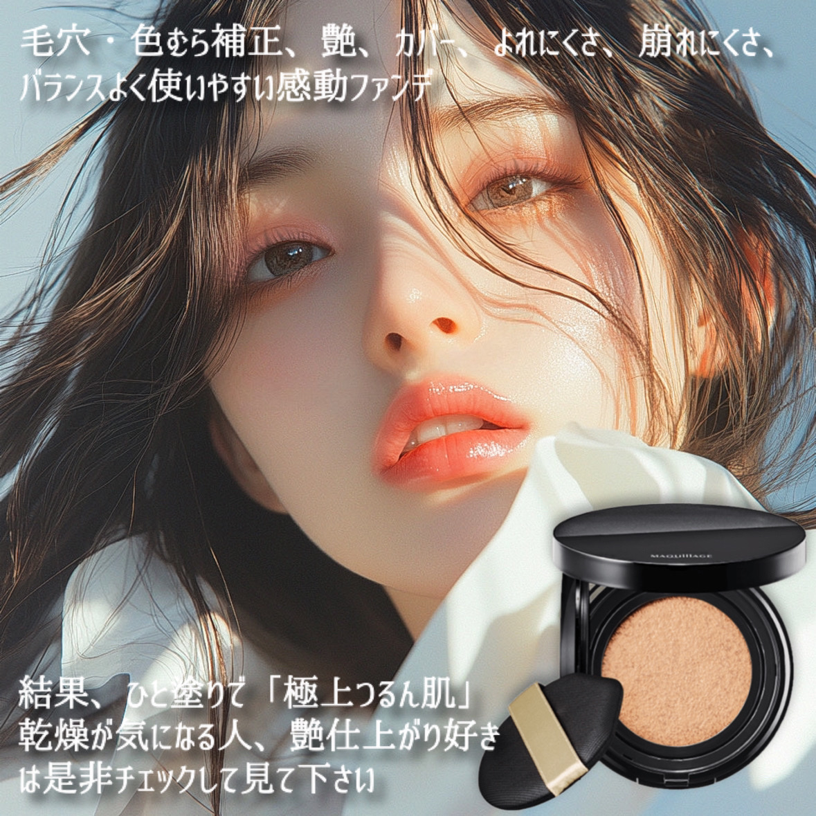 - ひと塗りで、つややかな「極上つるん肌」 スキンケア&密着フルカバーで1日中崩れない 毛穴レス美容液クッション SPF50+・PA++++ ①使うたび毛穴の目立ちにくい素肌が叶う美容液効果 浸透型うるおい美容液配合。 角層までうるおいを届け、肌のキメを整える ②ひと塗りで、密着フルカバー&みずみずしいつや 「透明つやフィルム」によって、毛穴や色ムラがなかったかのように密着&補正し、美しい仕上がりが持続 ※ケース別売り
