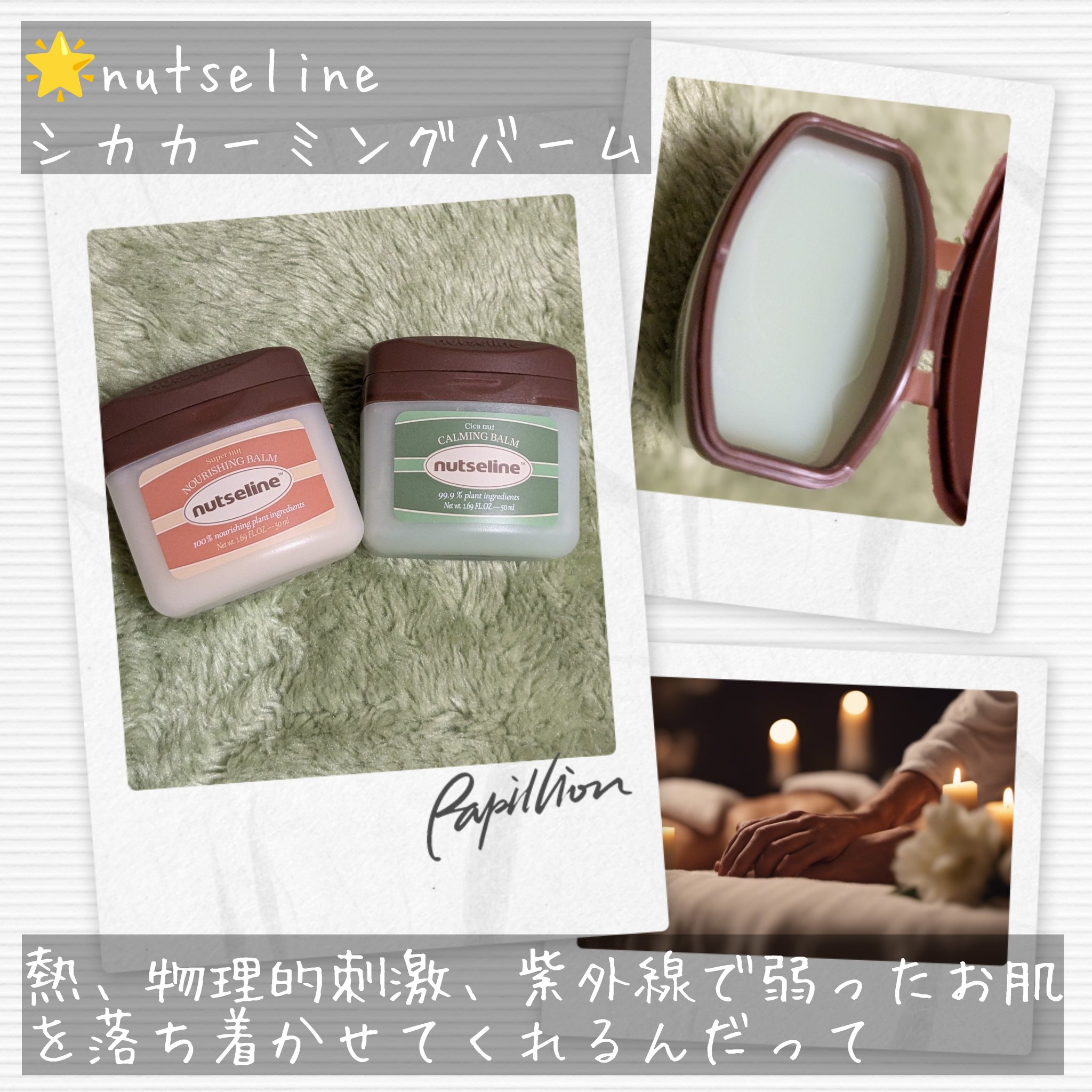 植物由来成分のヴィーガンマルチバームnutselineナリシングバームシカカーミングバーム固めのバームで粒感が時々あるけど体温でするっと溶けてなめらかに馴染む。べたつきは少なめ!どちらも顔やボディに使えるので乾燥が気になる部分にはナリシングバ...