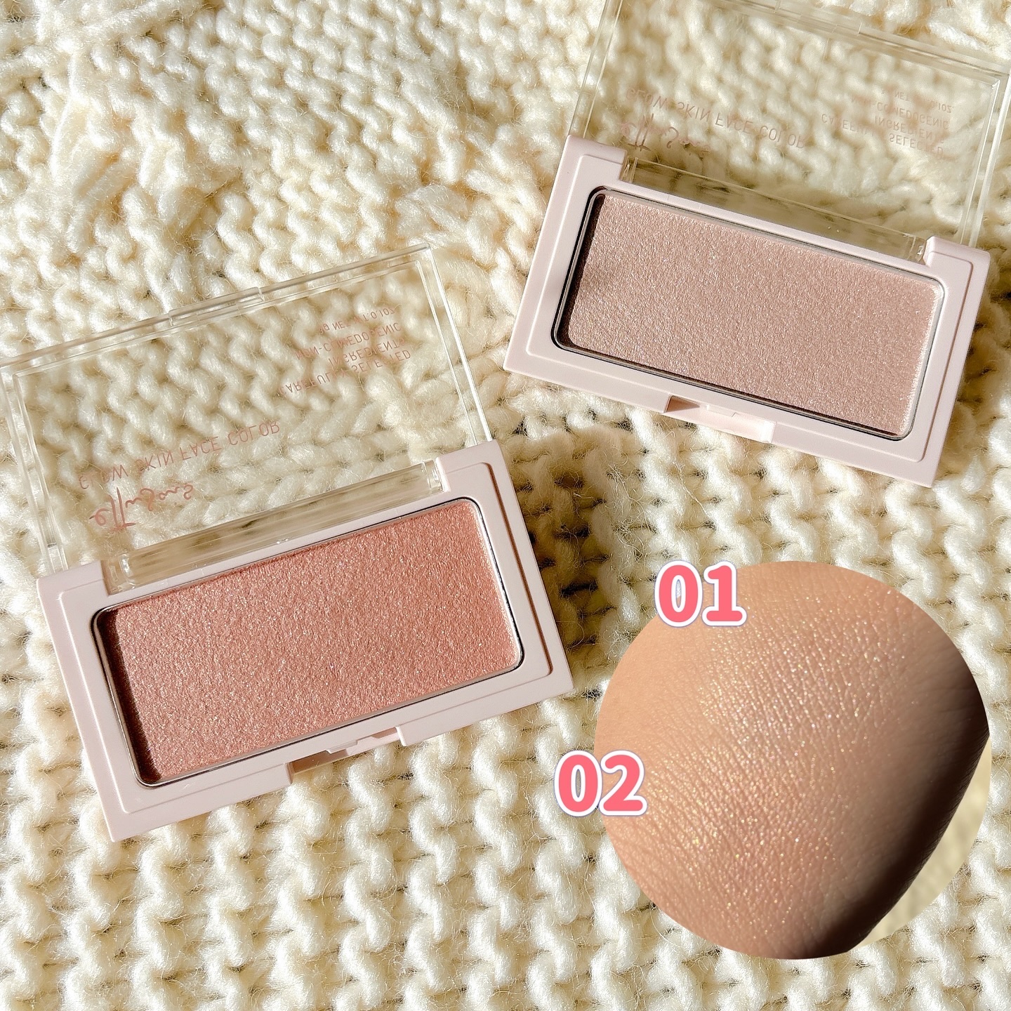 エテュセのフェイスカラー、待ってましたー!! もうね、ほんとうに使用感がよかった✨ うるおいが長時間続くスキンケア仕立てでテクスチャーだけでなく肌もしっとりが続く🫧 01 なじみつやハイライト 繊細な輝きでうるおったツヤ肌を演出 白浮しないピンクベージュ♡