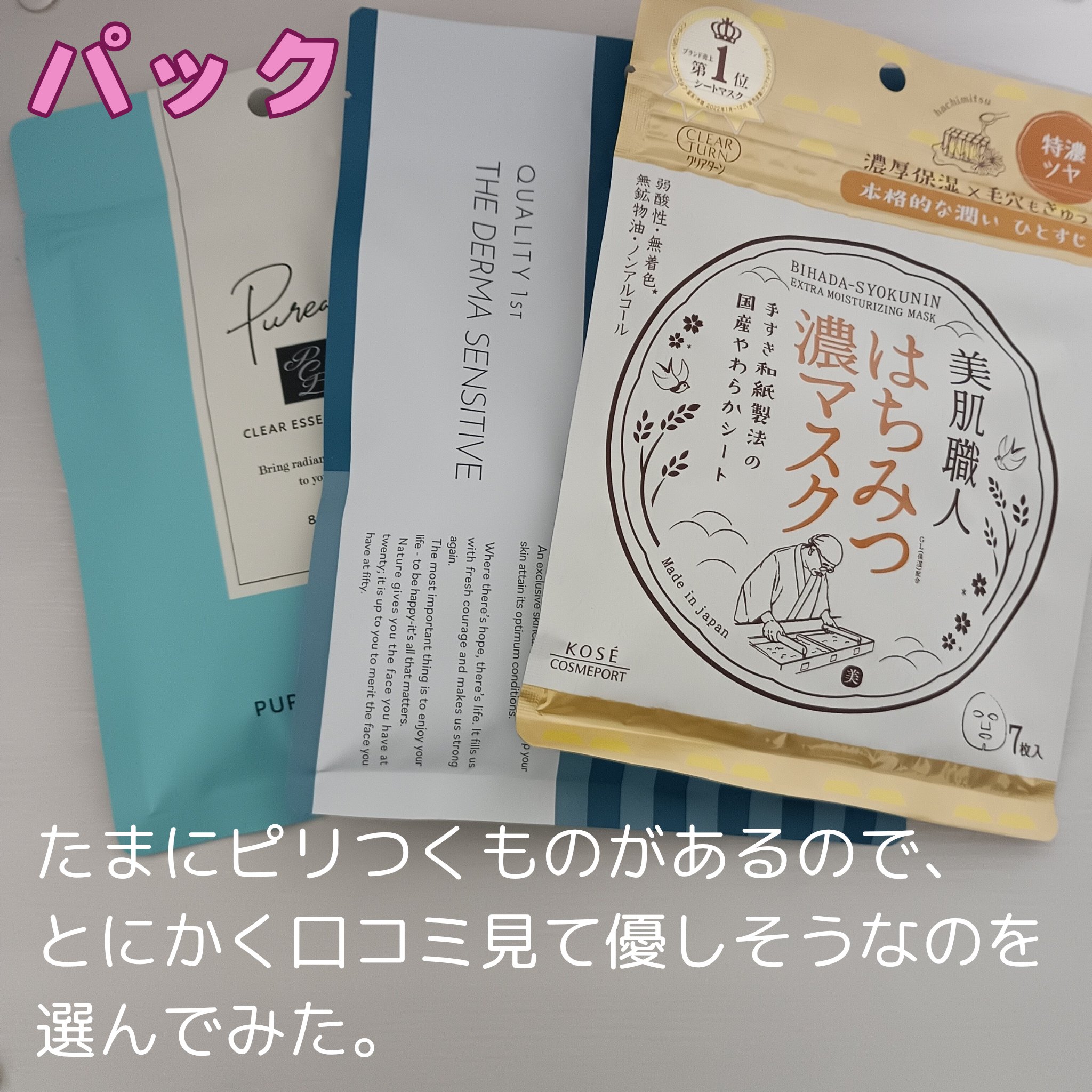こちらのシートマスクは、初売り特価で2袋1099円で購入できました。 1袋35枚入りなので、めちゃめちゃコスパ良いです。 シートは固めではありますが、なんといっても、液がひたひたに入っており、しっかり潤うことができます。 ベトベトしないので、これを使ってから、その日使いたい美容液をあわせて使うのがお気に入りの使い方です。